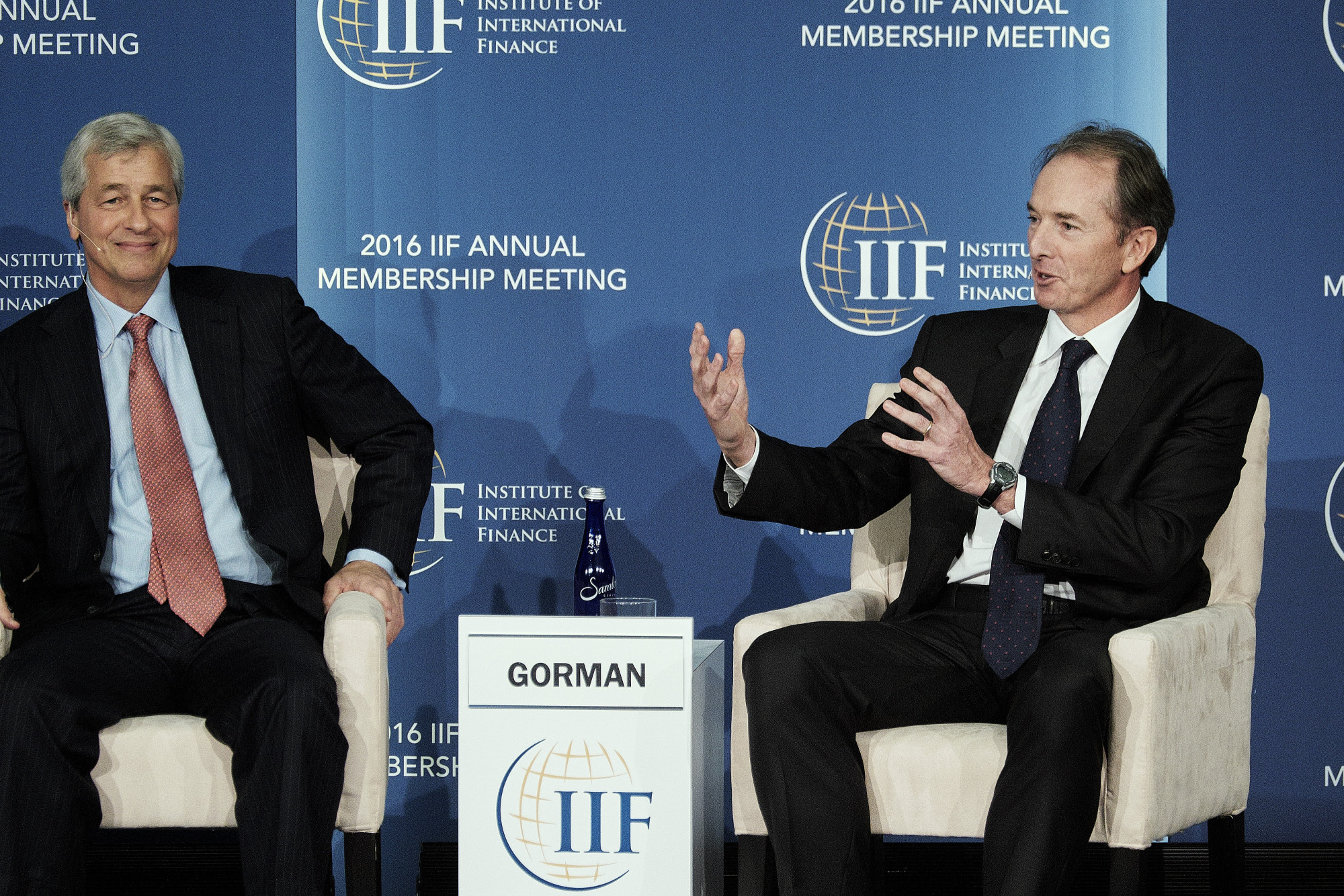 摩根士丹利首席执行官詹姆斯·戈尔曼(James Gorman)和摩根大通首席执行官杰米·戴蒙(Jamie Dimon)在2016年IIF年度会员大会上