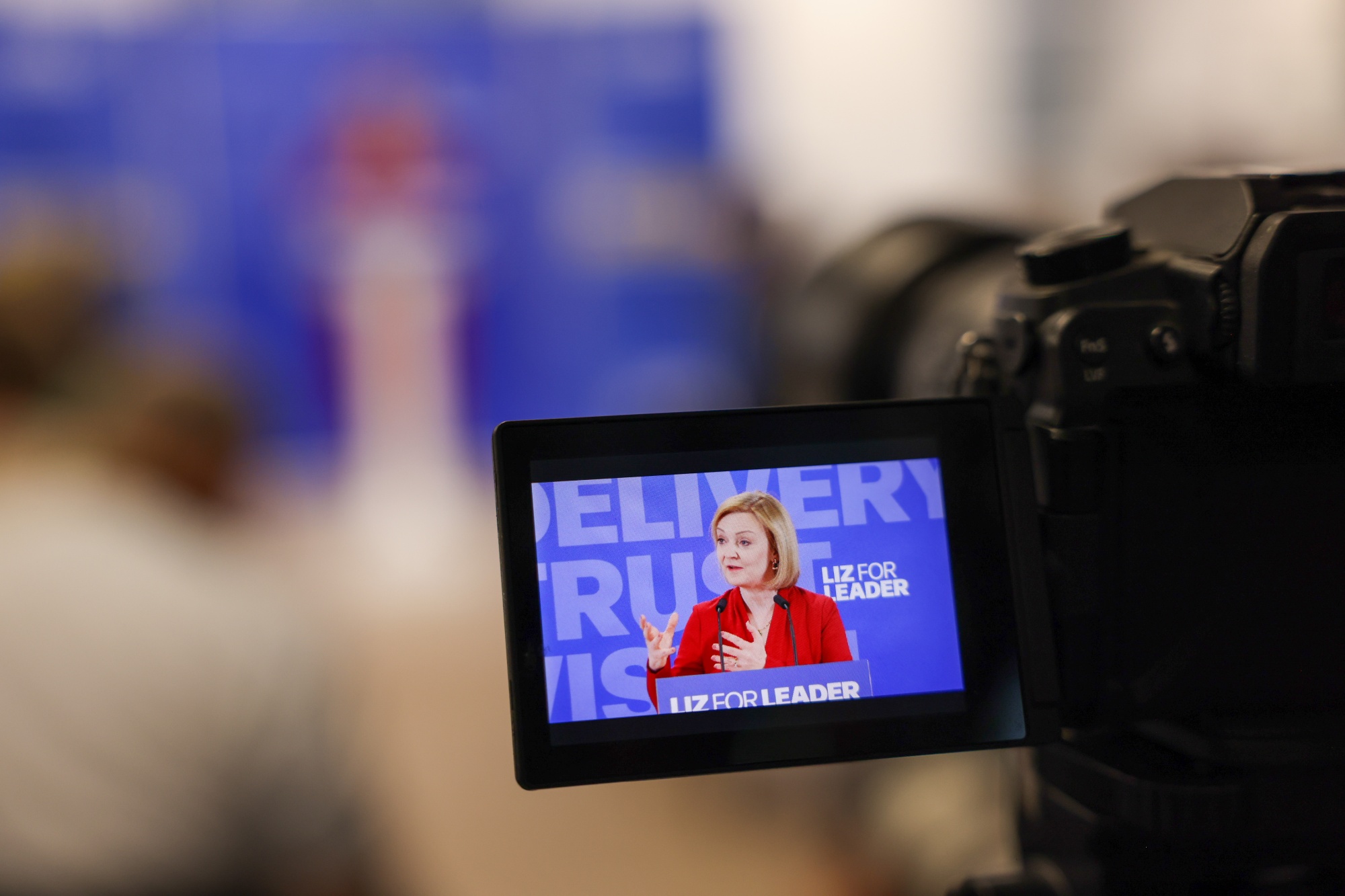英国外交大臣利兹·特拉斯在她的领导竞选发布会上。摄影师:Hollie Adams/Bloomberg### 刚刚发生了什么