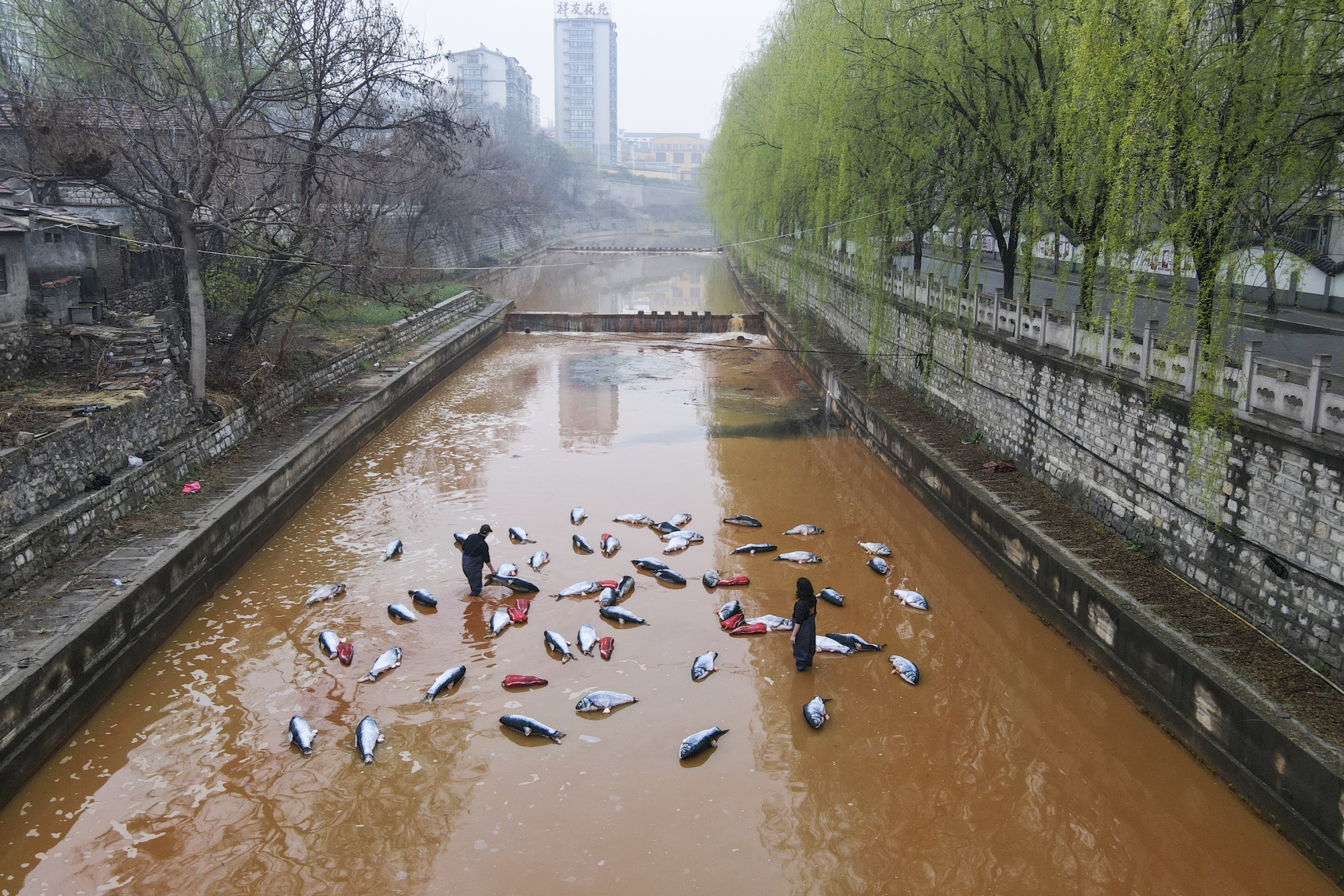 摄影师:Bronte Wittpenn/Bloomberg在中国东部城市淄博的一天清晨,两名扮成渔民的人在岳阳河污染的深褐色水域中搅动着数十个巨型充气鱼和辣椒,大喊着“淄博火锅鱼!”