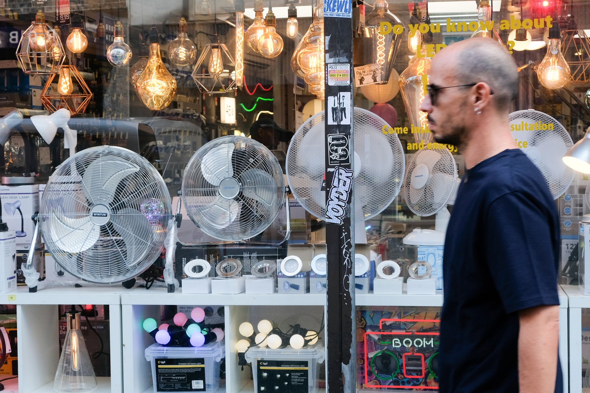 在英国伦敦一家商店出售的风扇。英国气象局发布了下周的最严重警告,预计气温将升至35摄氏度以上。