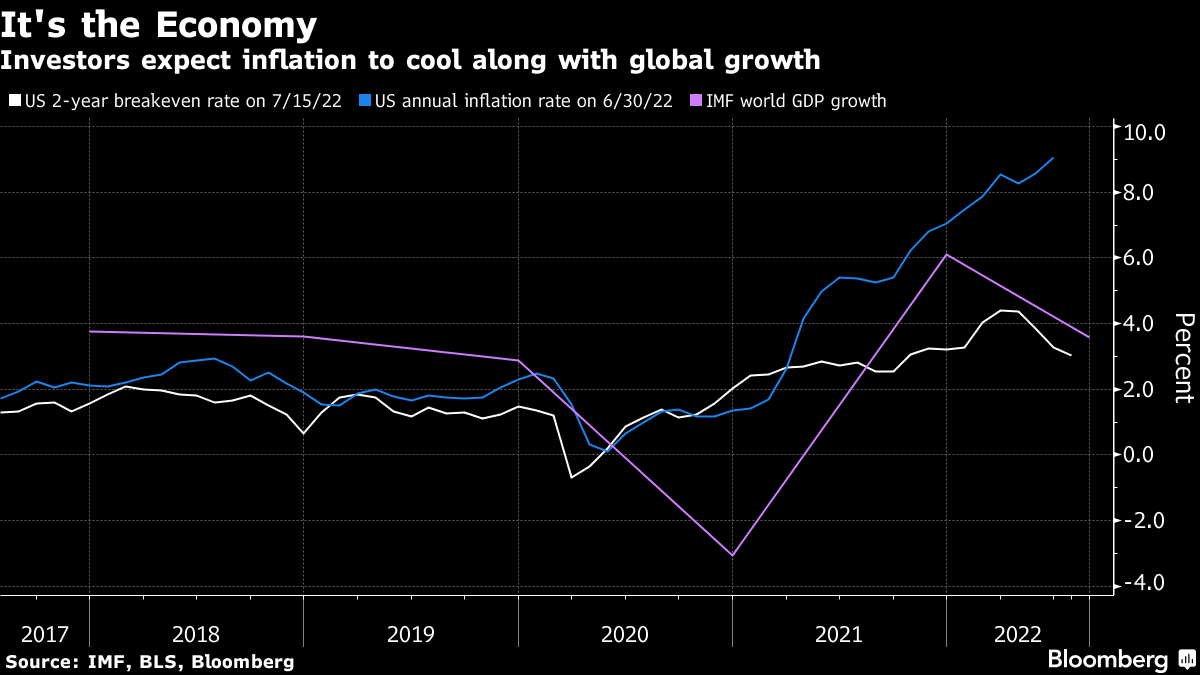 投资者在通胀问题上似乎确实坚定地站在短期团队一边。别管美国年度消费者价格指数达到9.1%,或者油价接近每桶100美元,国债市场预计未来两年通胀率将平均约为3%,根据通胀预期利差率。这似乎是预期基础效应的结合 —— 油价不太可能像自2020年7月以来那样翻倍 —— 以及美联储及其许多全球同行迅速加息的影响。上周末股市活跃起来,因为消费者对通胀的预期有所缓和,但其中也有隐忍之苦。这是因为对全球经济明显放缓的预期占据了乐观情绪的相当大一部分,认为成本压力将减弱。价格高到足以抑制一些支出,再加上美联储的货币政策,普遍预计将导致美国陷入衰退。世界大部分地区面临着类似的前景。