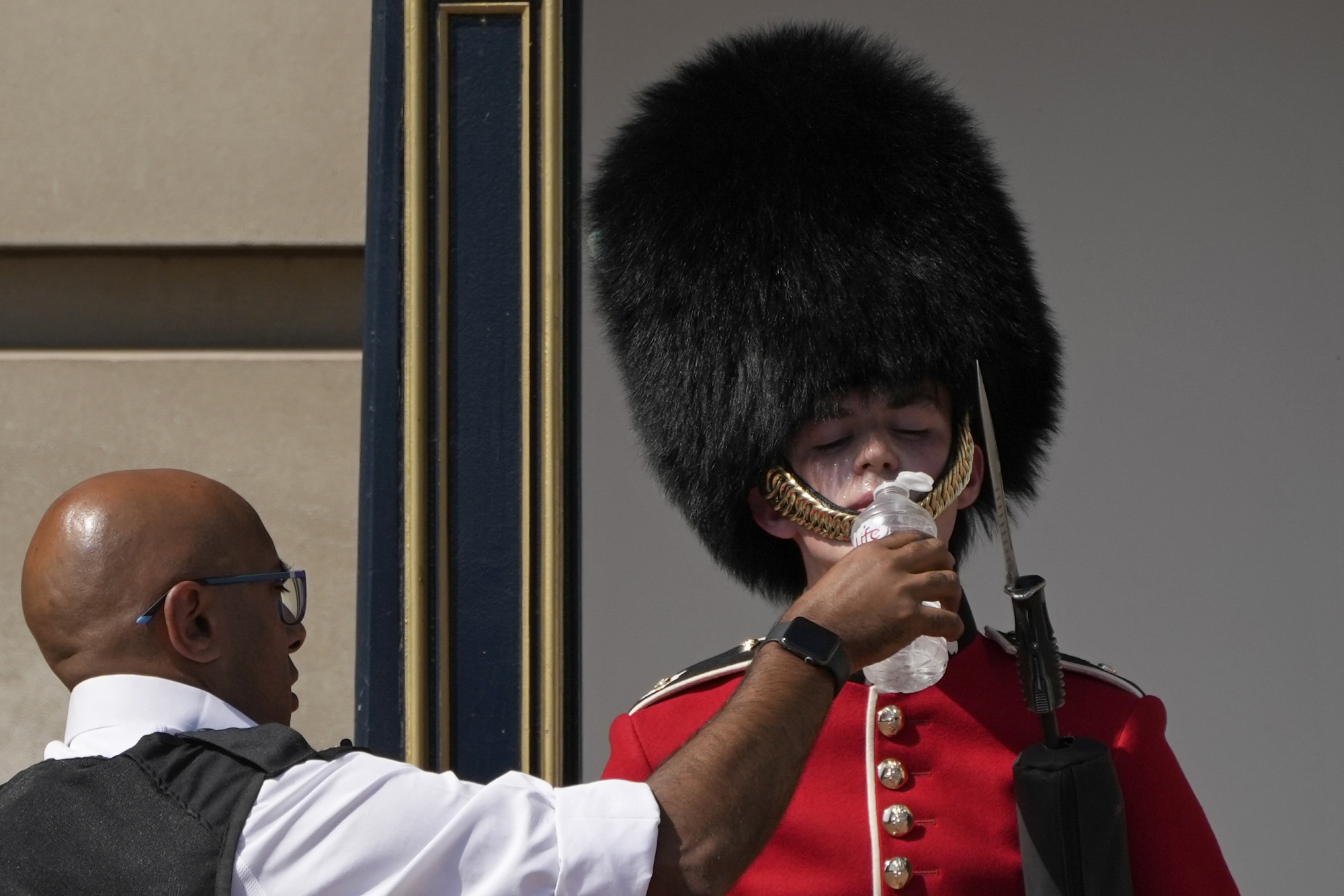 一名警察在伦敦白金汉宫外向一名戴着传统熊皮帽的英国士兵递水,在周一的炎热天气中。2022年7月18日,英国政府首次发布了极端高温的“红色”预警。这一警报覆盖了英格兰大部分地区,周一和周二的气温可能首次达到40摄氏度(104华氏度),对健康人群构成严重疾病甚至死亡的风险,英国气象局(Met Office)周五表示。 (AP图片/马特·邓纳姆)