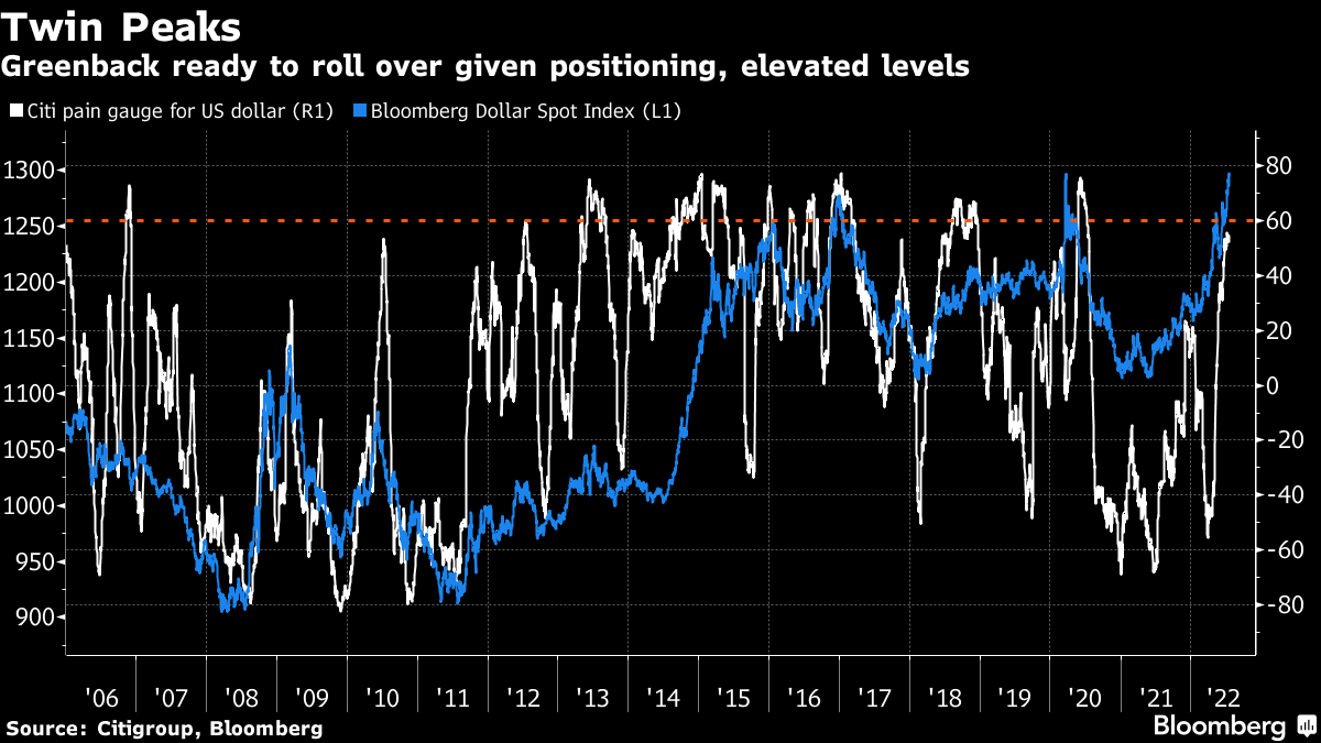 美元王冠看起来有些失光,因为美联储官员削弱了本月全面加息1个百分点的赌注。美元刚刚经历了一个月内最糟糕的两天下跌,尽管今年的强劲上涨趋势看起来不太可能在至少下周美联储会议之前中断,届时会提供更多关于我们距离加息周期峰值有多近的明确信息。本周欧洲和日本央行的会议也可能给美元带来新的活力,同时还有俄罗斯天然气供应限制的潜力。尽管如此,美元在过去一年半的不懈上涨可能接近极限,花旗集团的投资者仓位指标接近60水平,通常在美元见顶前不久会出现这一水平,而彭博美元现货指数触及自2004年创立以来的最高水平。如果美元在未来几个月见顶,我们可能会看到非常迅速的逆转。