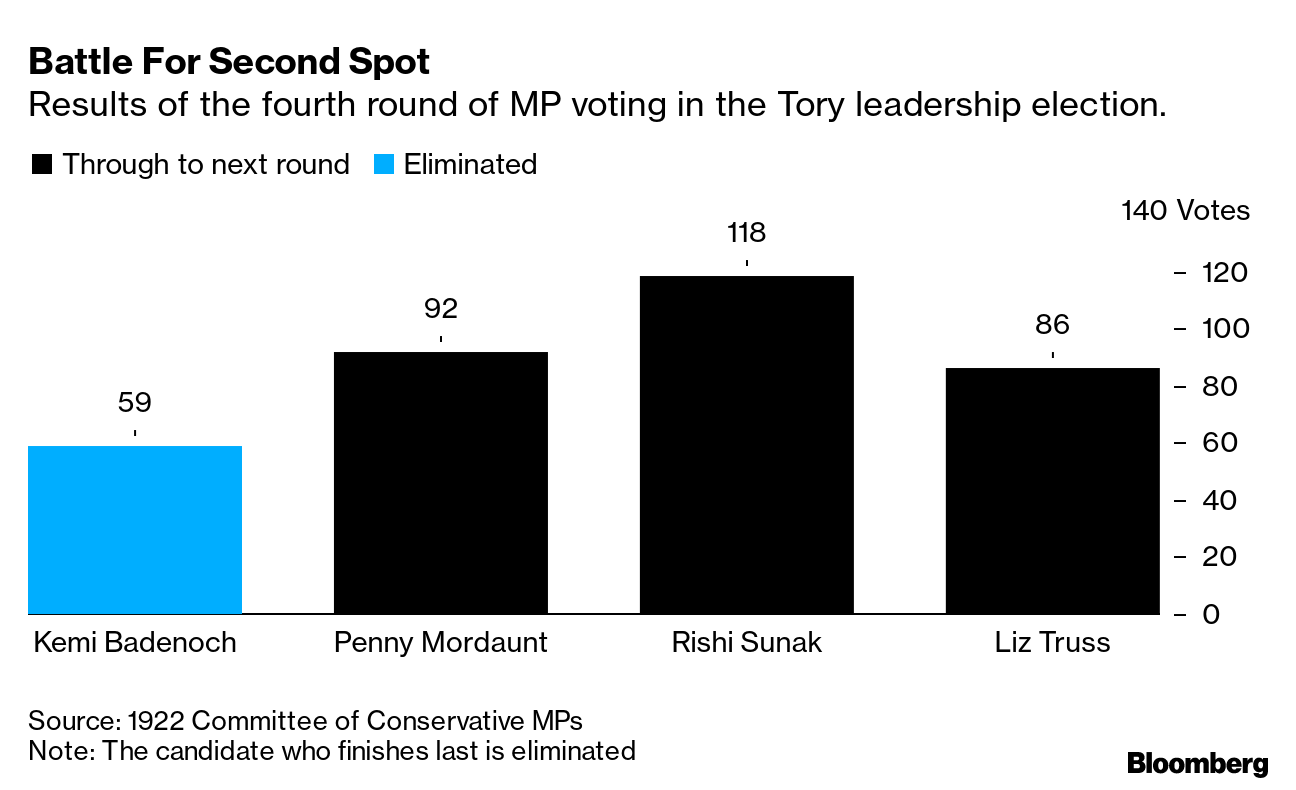肯尼·巴德诺退出,肯定已经确保了自己在下届政府中的角色;里希·苏纳克仍然领先(仅差一个议员就能达到119的门槛)。但是利兹·特拉斯获得了最多的选票。她现在以86票,仅落后于彭妮·莫丹特六票。