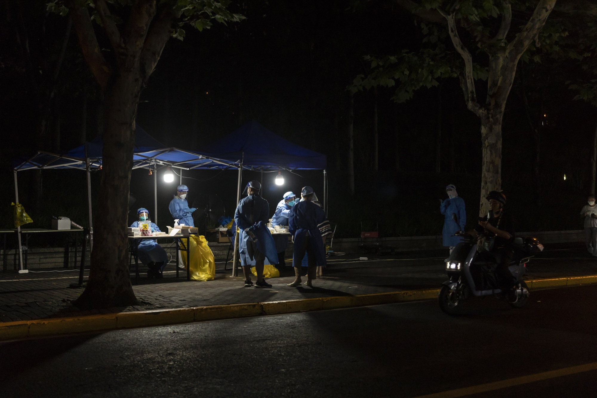 穿着防护服的医护人员协助上海居民进行新冠病毒检测,时间为7月19日。摄影师:沈其来/彭博社
