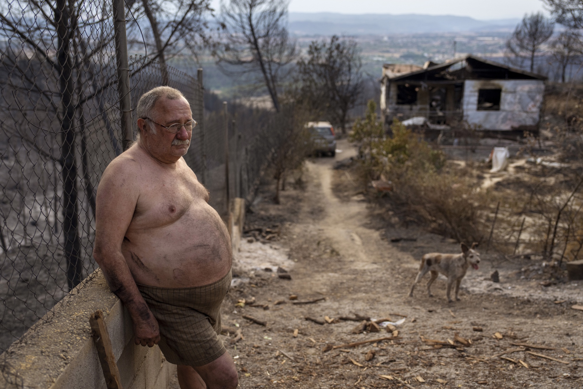 Jordi Villalta,62岁,站在他在西班牙El Pont de Vilomara附近River Park村庄因山火而被烧毁的房子旁,2022年7月19日星期二。在西班牙东北部的Bages地区被山火烧毁后,数百名居民急于返回家园,评估损失的程度。在逃离火焰之前,Jordi甚至无法挽救他的衣服,“我现在只剩下身上穿的衣服了,我失去了一切,”Jordi说。(AP Photo/Emilio Morenatti)