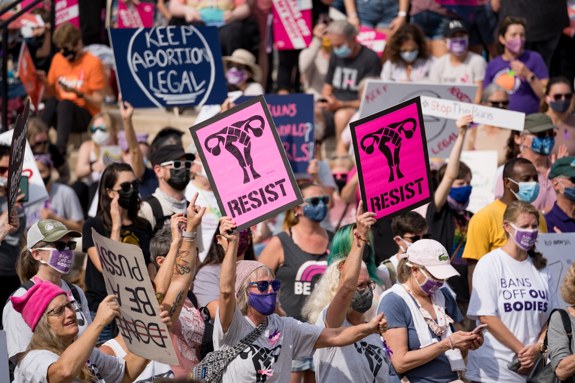 示威者在2021年10月2日在亚特兰大乔治亚州议会大厦集会,支持妇女的生殖权。