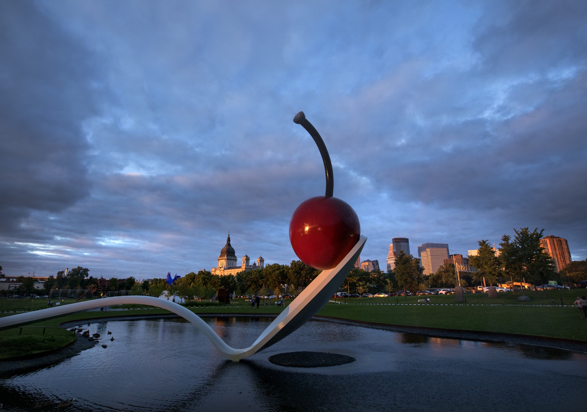 在明尼阿波利斯的沃克艺术中心展出的雕塑“汤匙桥和樱桃”。摄影:Brian Peterson/明尼苏达星论文社通过盖蒂图片社“这是一个美妙的案例,公共艺术最终定义了一个城市如何看待自己,以及他人如何看待一个城市,”纳尔逊-阿特金斯的策展事务副主任威廉·基斯·鲁道夫说。