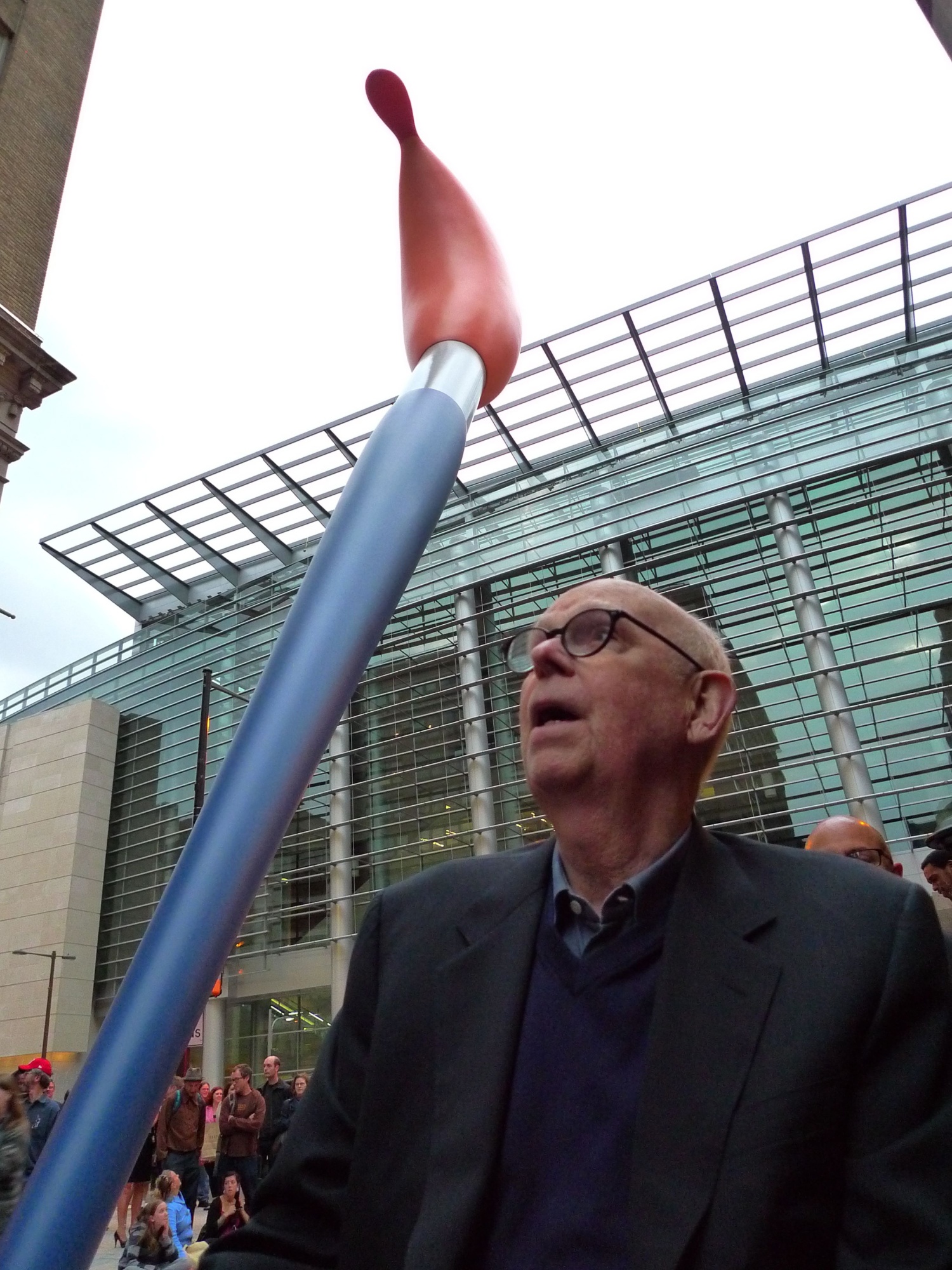 克拉斯·奥尔登堡在2011年于宾夕法尼亚美术学院“绘画火炬”前。摄影师:I C Rapoport/Archive Photos via Getty Images奥尔登堡和范·布鲁根到来时,公共艺术已经完全处于变革之中,与达达主义和抽象表现主义相关的艺术家们将他们的想法以嬉戏巨型雕像的形式呈现给公众。像巴勃罗·毕加索的“芝加哥”(位于戴利广场)或亚历山大·考尔德的“三角形和拱门”(位于纽约州奥尔巴尼的帝国州广场)等作品展示了艺术家们如何在1960年代将公共艺术的语言颠倒过来,借鉴了晦涩的灵感源泉,而不是任何共同的市民历史或文化意识。