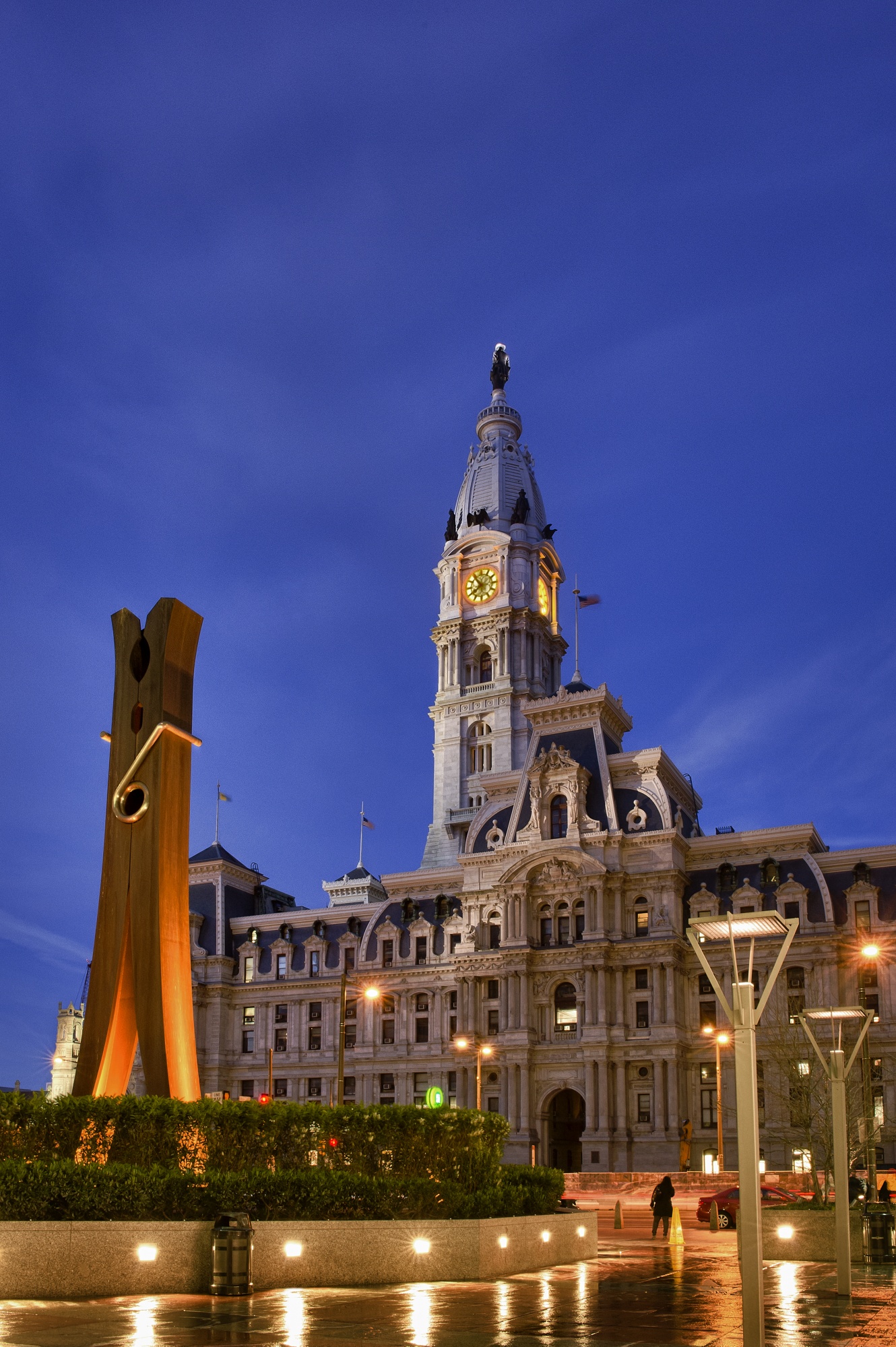 费城的“衣夹”和市政厅。摄影师:约翰·格雷姆/光火箭然而,当参观博物馆的公众看到奥尔登堡和范布鲁根的作品——“羽毛球”,一套四个用于打羽毛球的羽毛球,每个都有一辆大众汽车那么大——一些密苏里人仍然感到震惊。