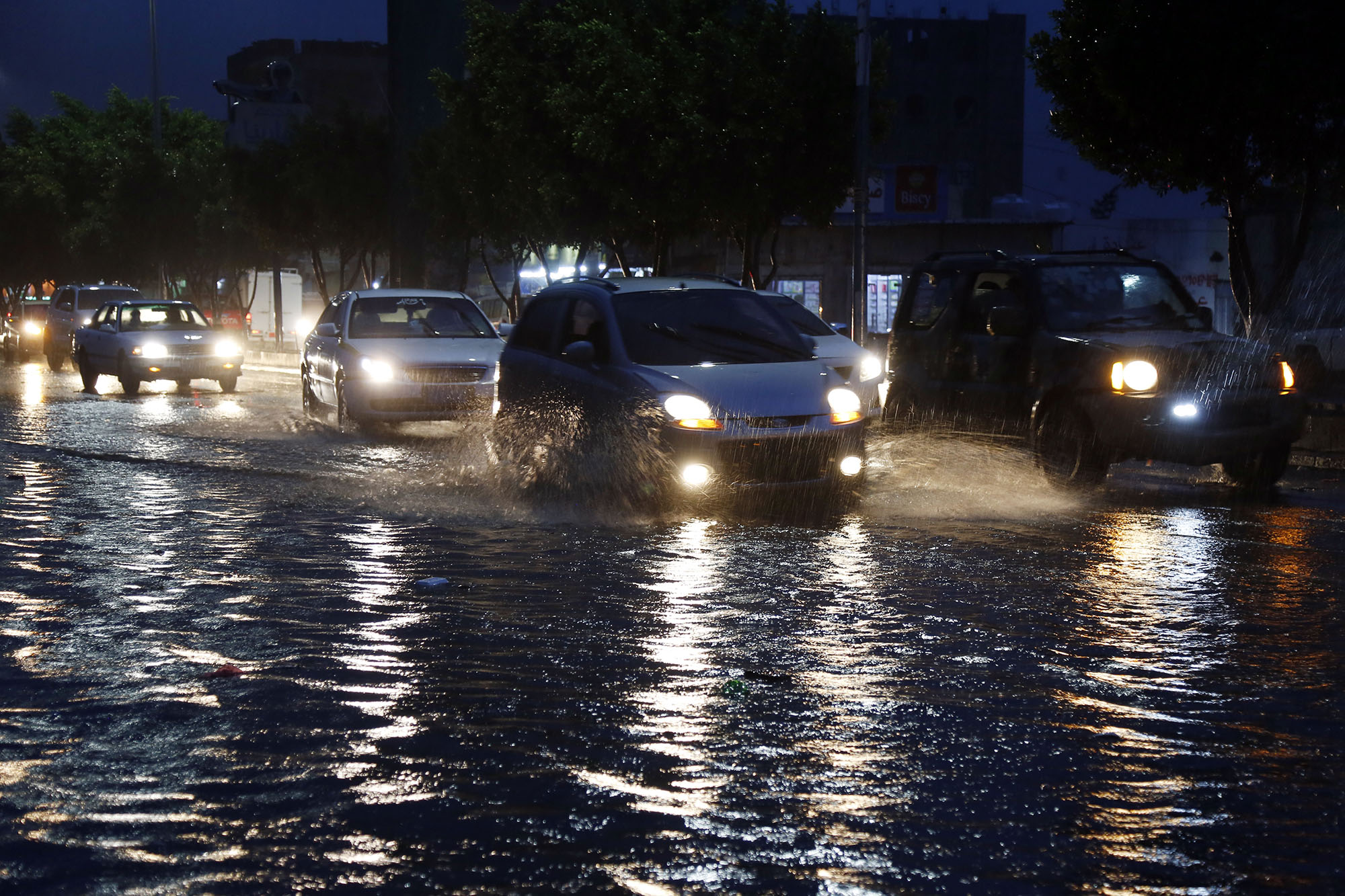 车辆在也门萨那市一条被暴雨淹没的街道上行驶,时间是7月23日。
