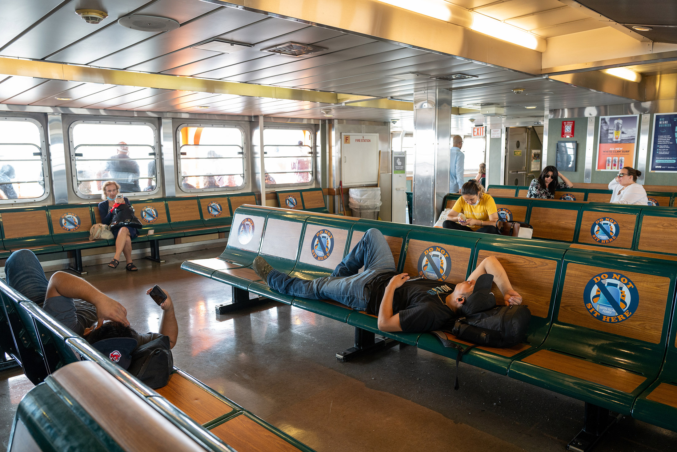 人们在纽约的斯塔滕岛渡轮上休息,当时气温已经升至90多度,时间是7月21日。