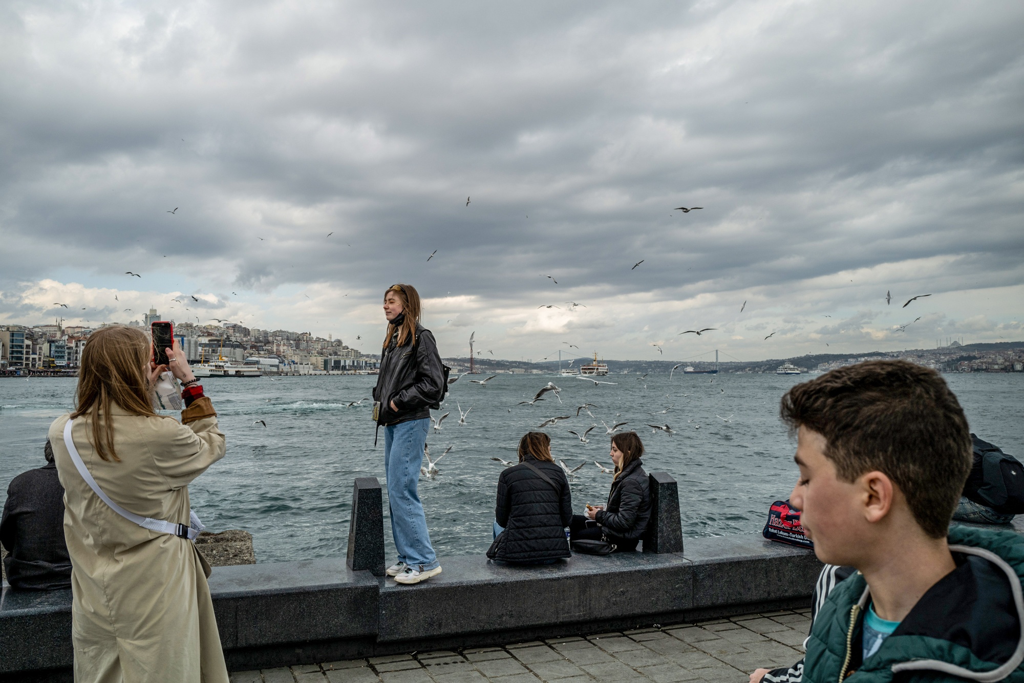 一名游客在土耳其伊斯坦布尔埃米诺努海滨拍照。摄影师:Nicole Tung/Bloomberg