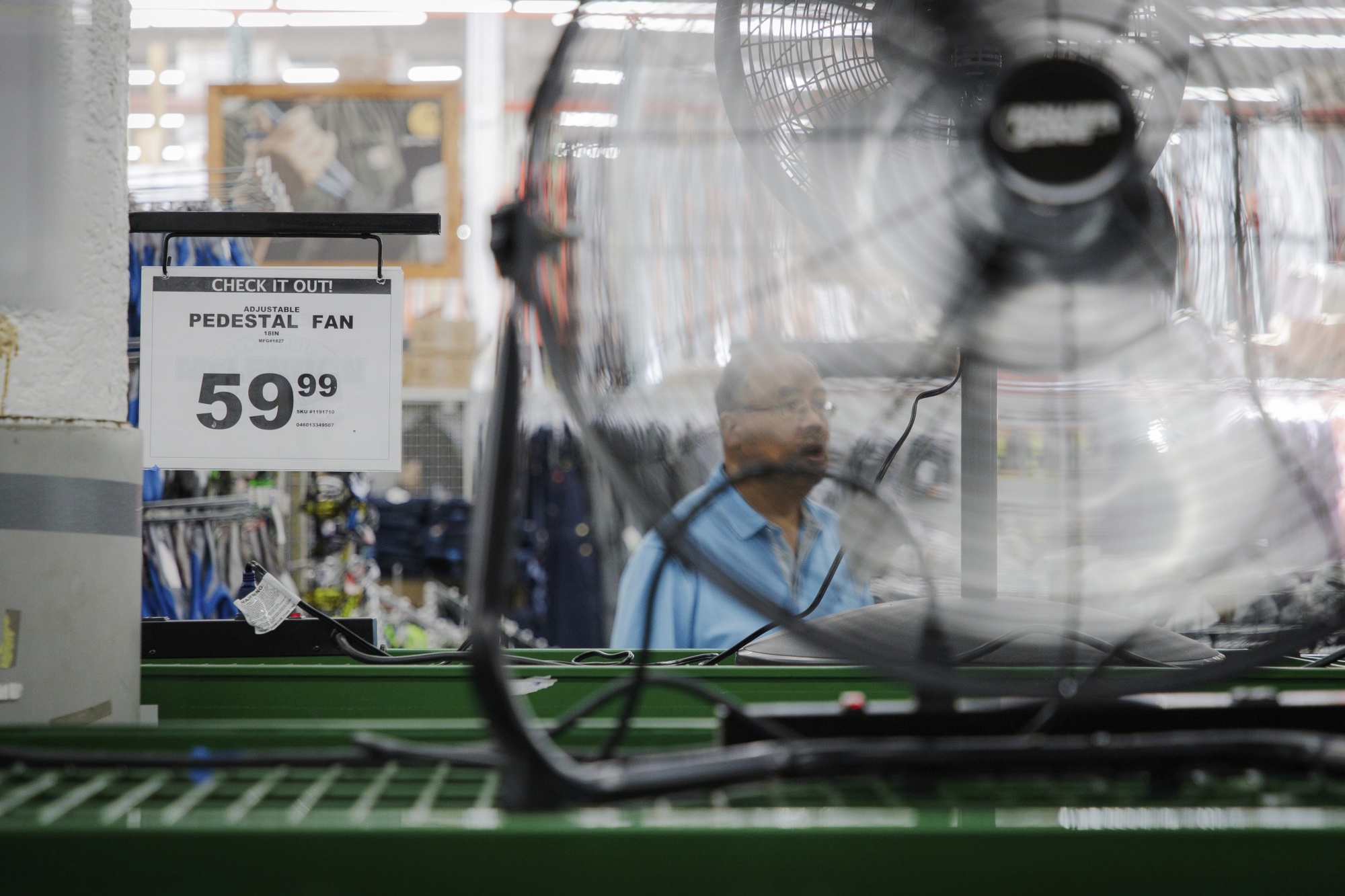 空调、风扇和其他冷却设备的堆放物排列在华盛顿州雷登市的麦克伦登五金店入口处,2022年7月24日星期日。太平洋西北地区正在为一场重大热浪做准备,本周气温预计将在一些地方超过100华氏度(37.8摄氏度),气候变化推动了这一地区历史上罕见的热浪变得更长。 (科里·铃木/西雅图时报,通过美联社)