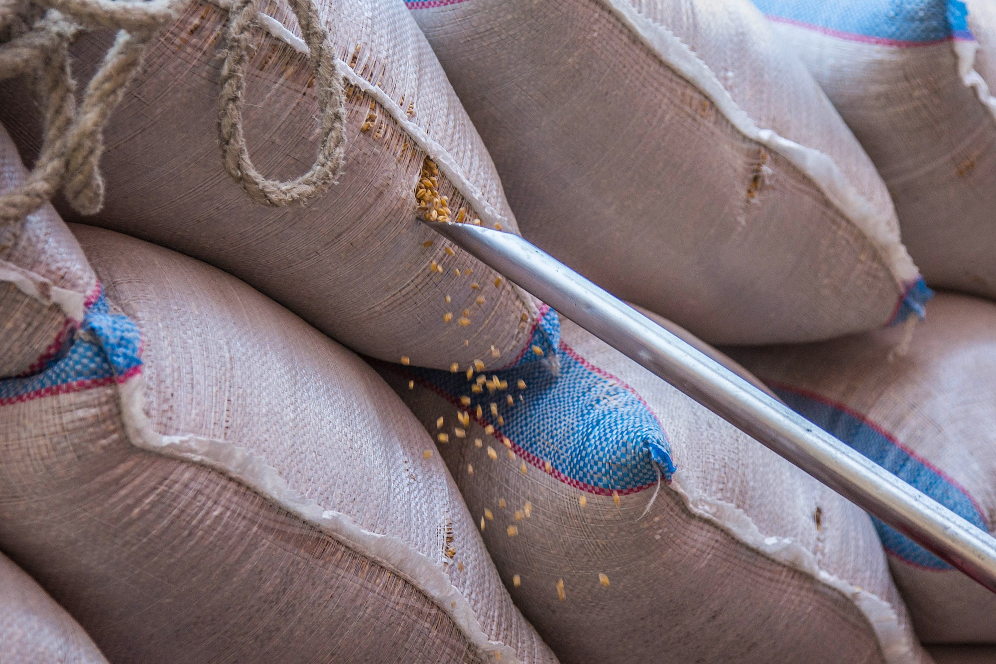 一名工人在埃及中部法尤姆的政府经营的磨坊收集小麦样品,时间为5月19日。
