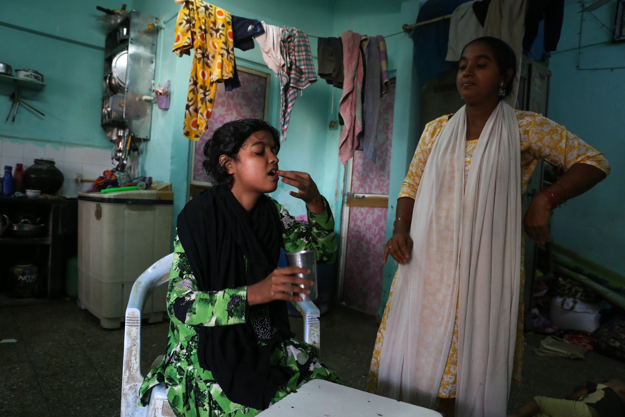 19岁的Khadija Ansari在2022年7月在Natwar Parekh的家中在母亲Yasmeen的帮助下服用结核病药物。摄影师:凯瑟琳·戴维森。“这个地区居住风险很高。这里的大多数人都患有结核病,”她的母亲Yasmeen说。“在这栋建筑里,大约有六七个人患有结核病。”