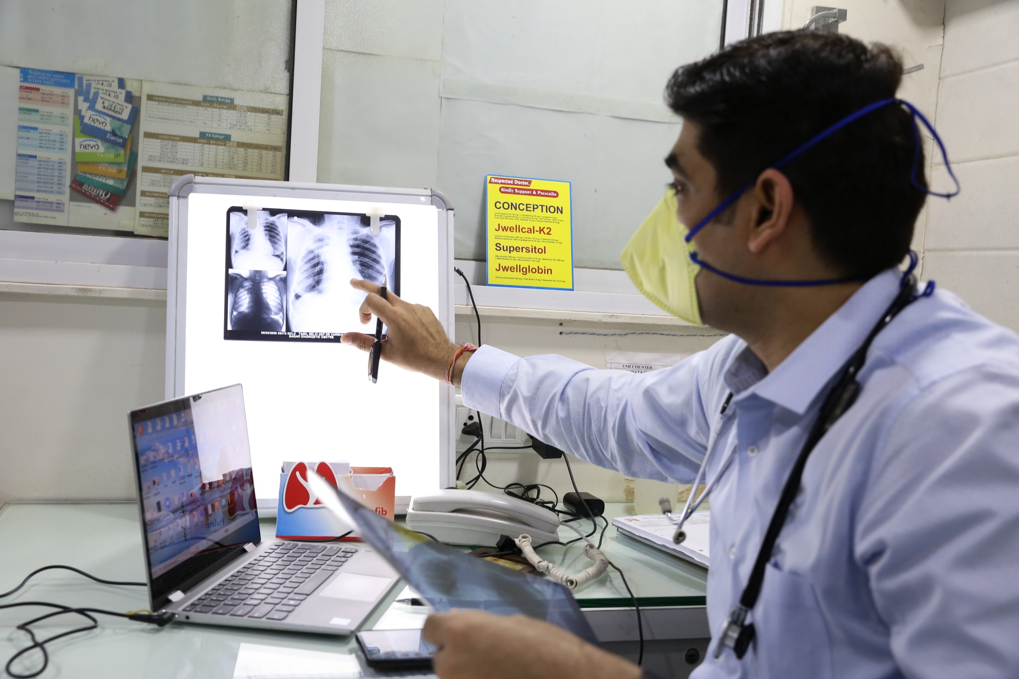维卡斯·奥斯瓦尔博士检查一名疑似结核病患者的X光片。摄影师:凯瑟琳·戴维森。全球范围内耐所有一线抗生素的结核病,即MDR-TB,正在增加,并对根除该疾病的努力构成巨大威胁。印度拥有全球最多的MDR-TB病例,贡献了全球四分之一的负担,孟买是一个热点。