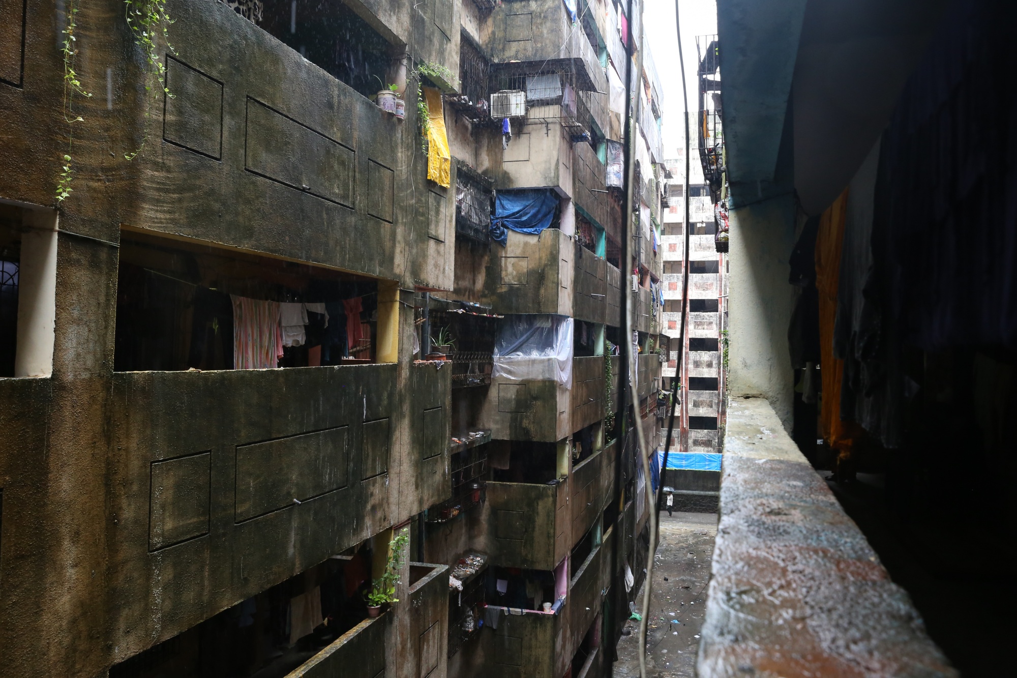 像Natwar Parekh这样的贫民窟改造项目只需要与相邻建筑物保持三米的距离,导致下层楼层光线和通风极为有限。摄影师:Catherine Davison。孟买的空间紧缺,“通常发生的情况是,贫民窟改造项目被挤在一块非常非常小的土地上,”Padora说道,他将这些密集的建筑项目描述为“像仓库一样容纳人们——为他们建造这些盒子供居住。”