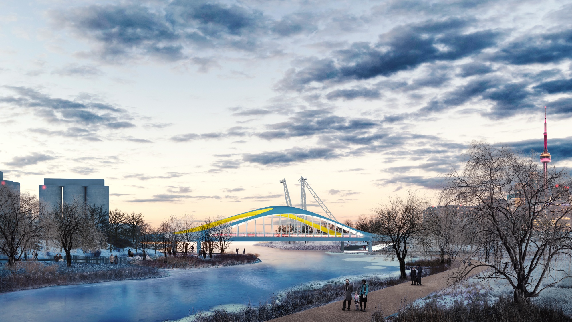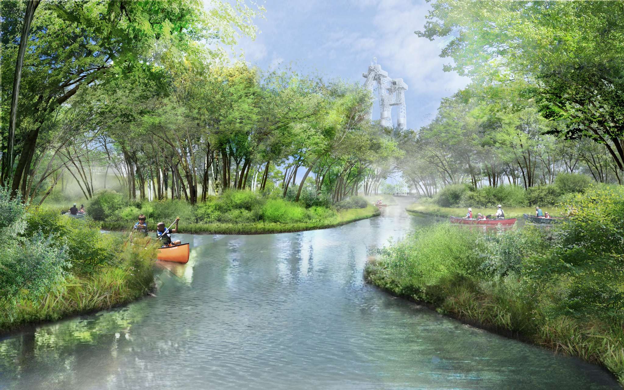 该项目将包括64英亩的公园,75英亩的野生动物栖息地和一条新的蜿蜒河道。来源:多伦多滨水机构移动一条河流