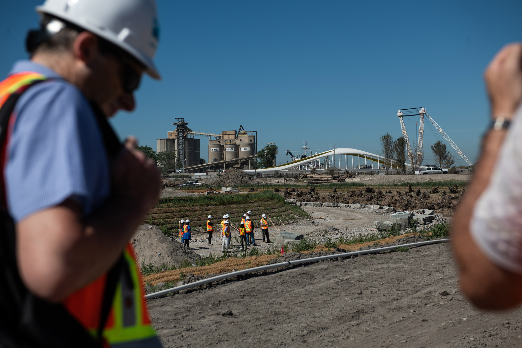 在一个充满阳光的六月晚春的美好日子里,这个地区是一片无边无际的挖掘机和尘土。数百英亩被刮平、晒干的土地上,点缀着横跨干燥的新挖掘河床的未来主义桥梁,突显了工程的巨大规模。