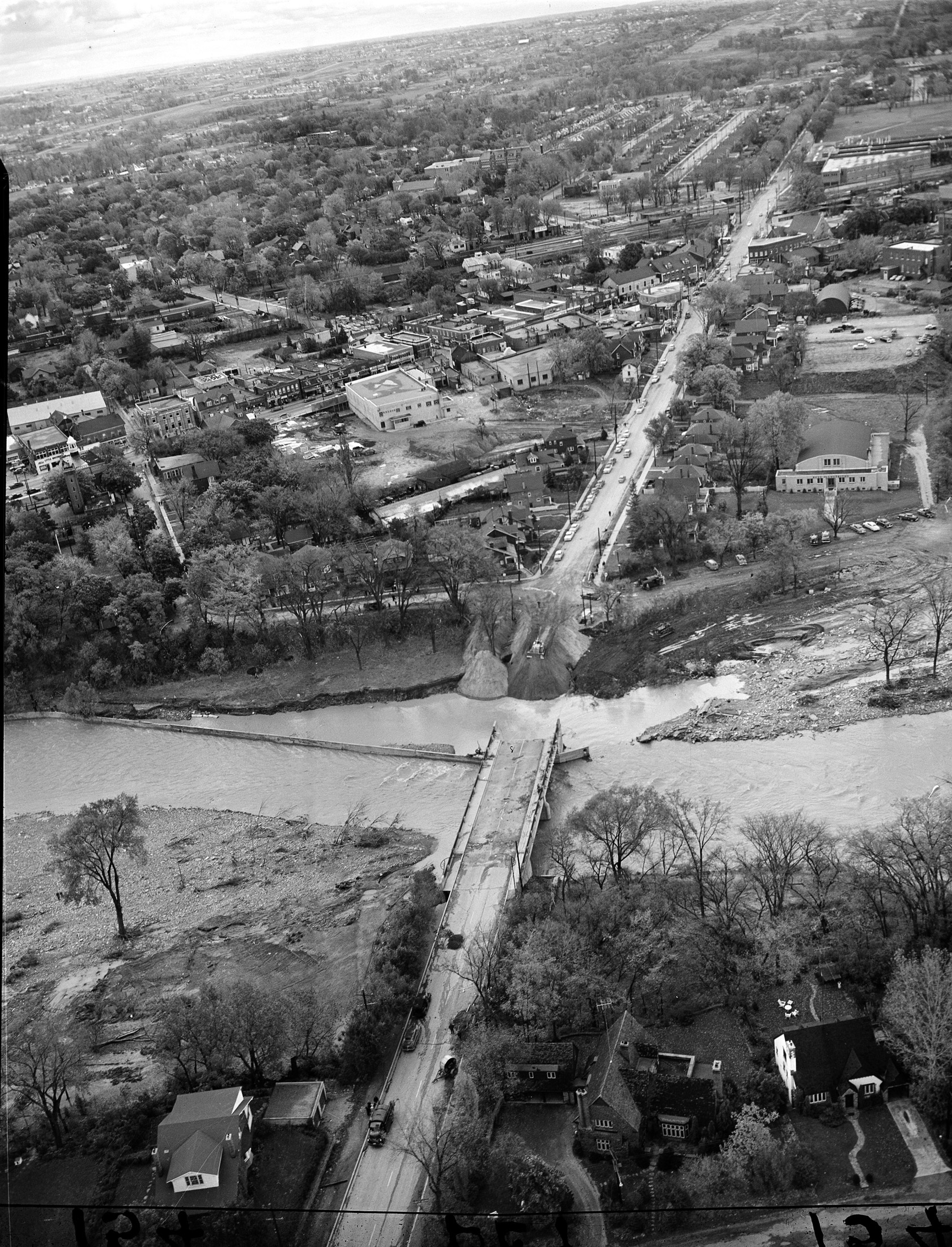 1954年10月17日,连接多伦多西部两个郊区的劳伦斯大道桥受损。来源:美联社照片飓风哈泽尔的影响受到了20世纪初毁掉多伦多唐河自然三角洲形成的决定的恶化,迫使城市东部的一个4万英亩流域通过一个60英尺宽的水道排入湖中。随着多伦多人口的增长——以及大片土地被铺设——雨水径流增加,使城市的河流系统更容易受到暴雨的影响。