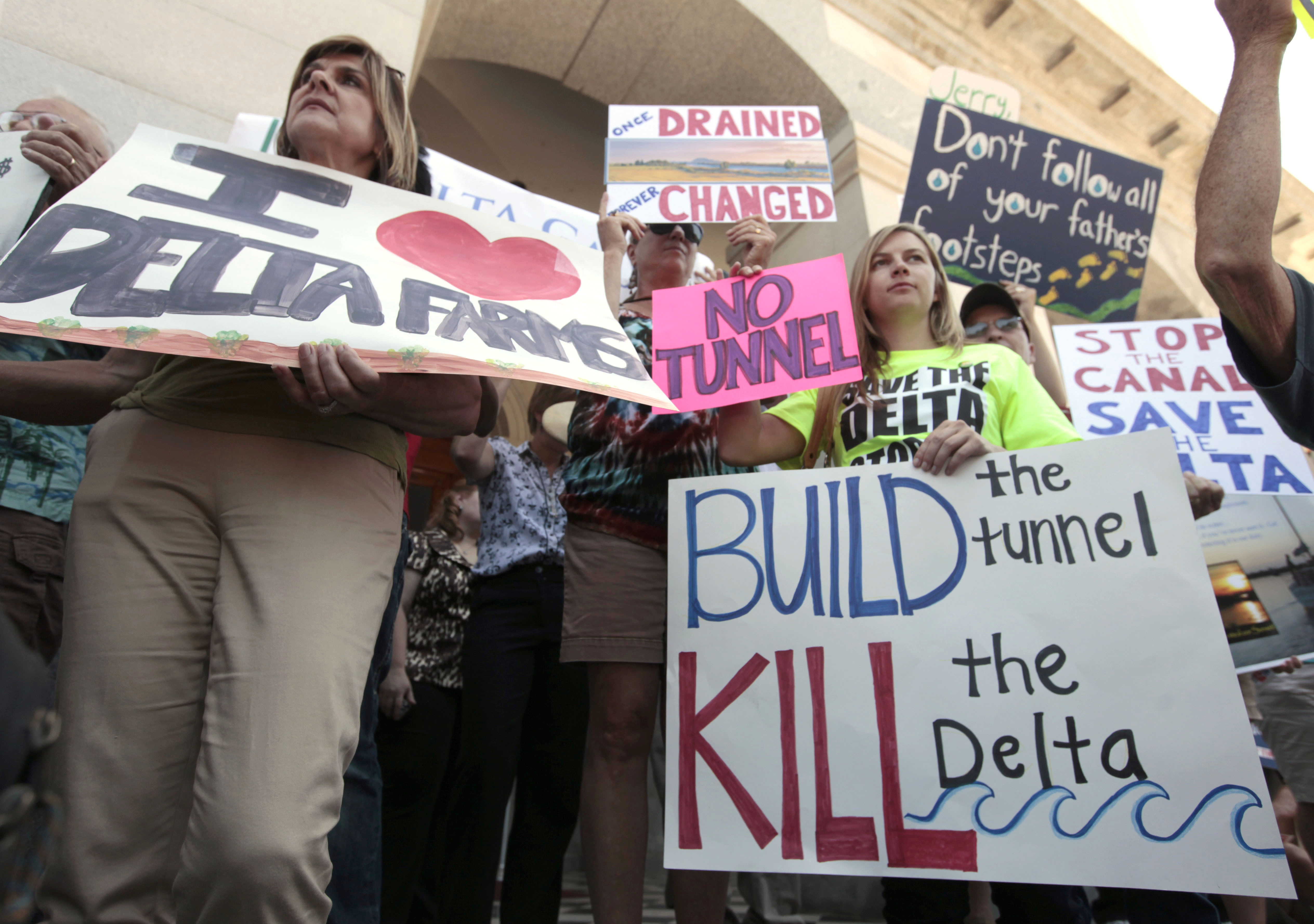 文件 -- 示威者在国会大厦集会,抗议加州州长杰瑞·布朗宣布建造一个巨大的双隧道系统,将水从萨克拉门托-圣华金河三角洲输送到南加州,2012年7月25日星期三。加州州长加文·纽森的政府已将该项目缩减为单一隧道,但该项目仍然受到许多批评。加州水资源部于2022年7月27日发布了一份报告,概述了他们对巨大水系统的首选路线,该系统将把水从北方重新引到南方。(美联社照片/里奇·佩德龙塞利,文件)