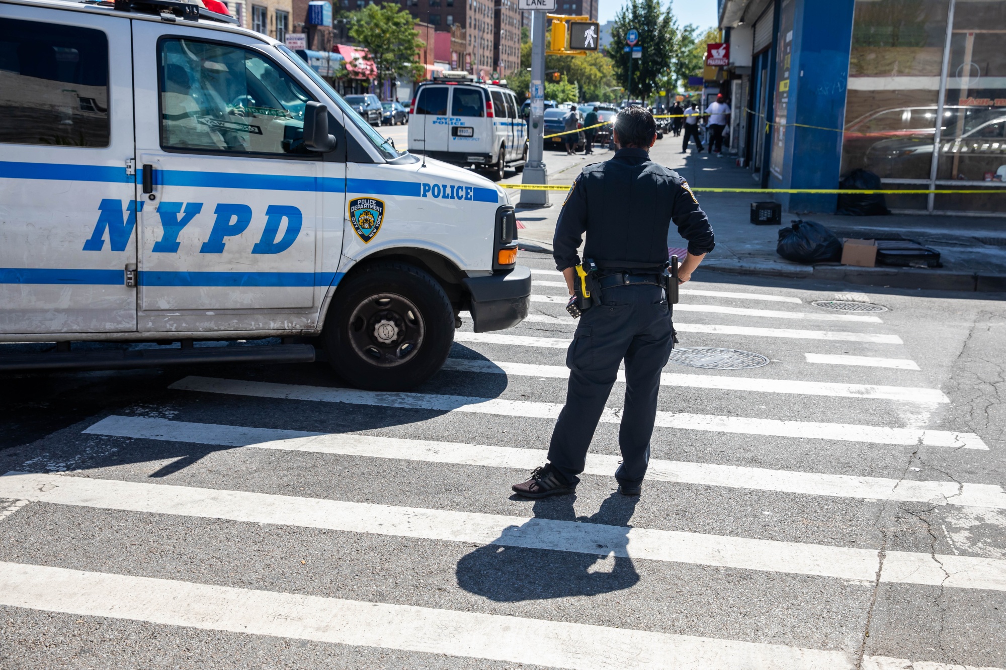 纽约市警察局一名警官在美国纽约布鲁克林区布朗兹维尔社区第73警区监视一起犯罪现场,时间是2021年9月19日星期日。