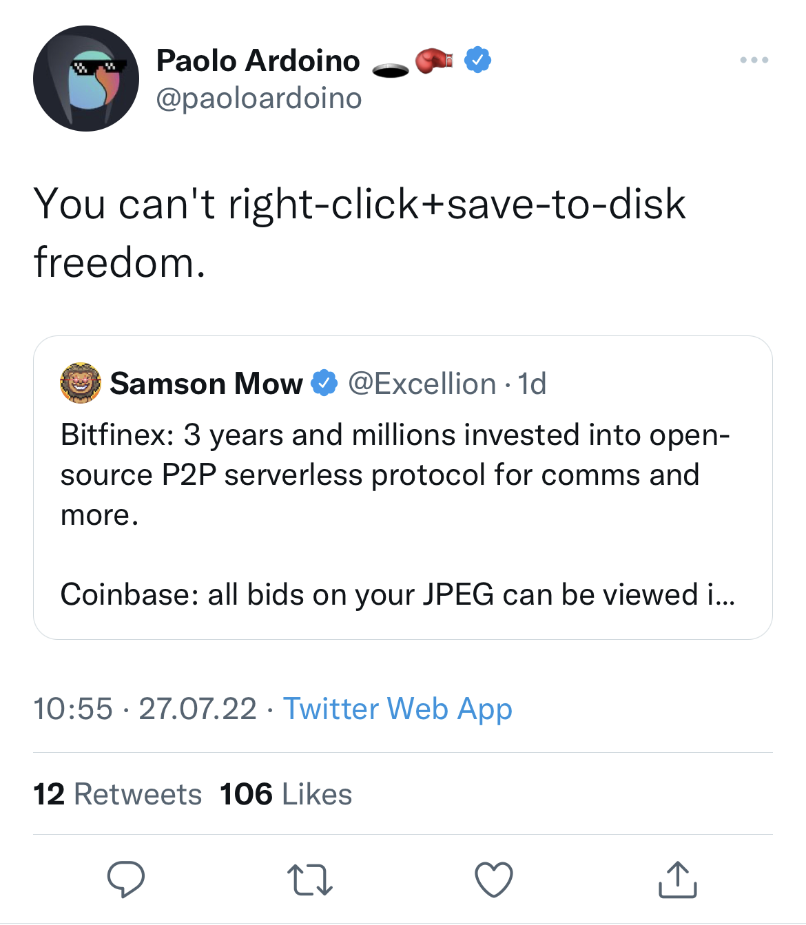 来源: @paoloardoino](https://twitter.com/paoloardoino/status/1552216090427670528)这无疑是一个高尚的目标。但这里还有另一个有趣的可能性,更与 Tether 自身的前景密切相关。未来的 Holepunch 可能有助于处理点对点支付,这对于加密货币的反大哥吸引力至关重要,但在全球范围内受到监管机构的威胁。想象一下 WhatsApp 用于商业,但实际上是到处都是加密支付,没有中央中介。