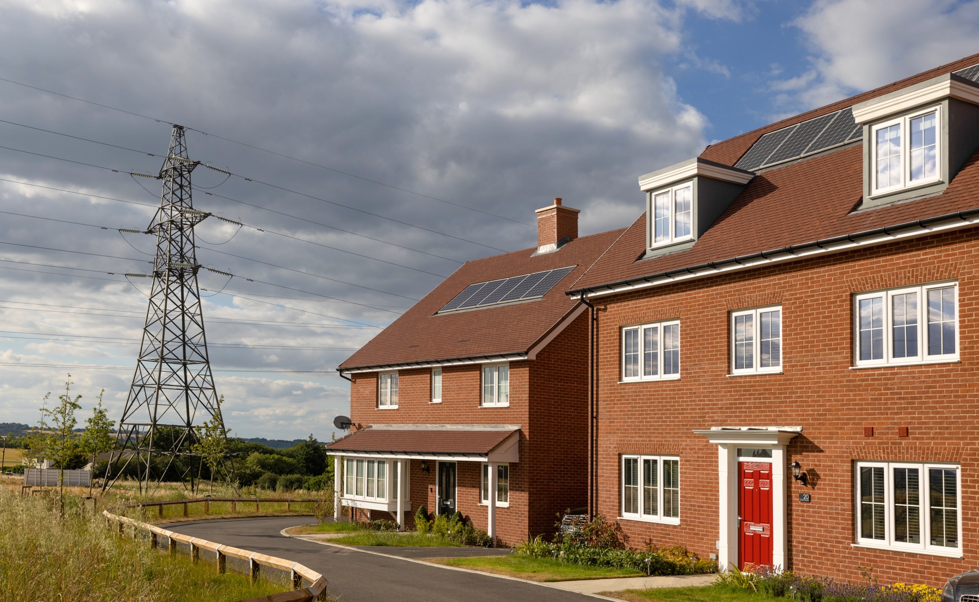 在英国雷利,新建住宅附近安装了太阳能电池板的电力输电塔。特拉斯承诺暂时取消绿色能源征税,每个家庭可节省155英镑。摄影师:克里斯·拉特克利夫/彭博社不断上涨的能源价格也可能考验她对乌克兰问题的决心。