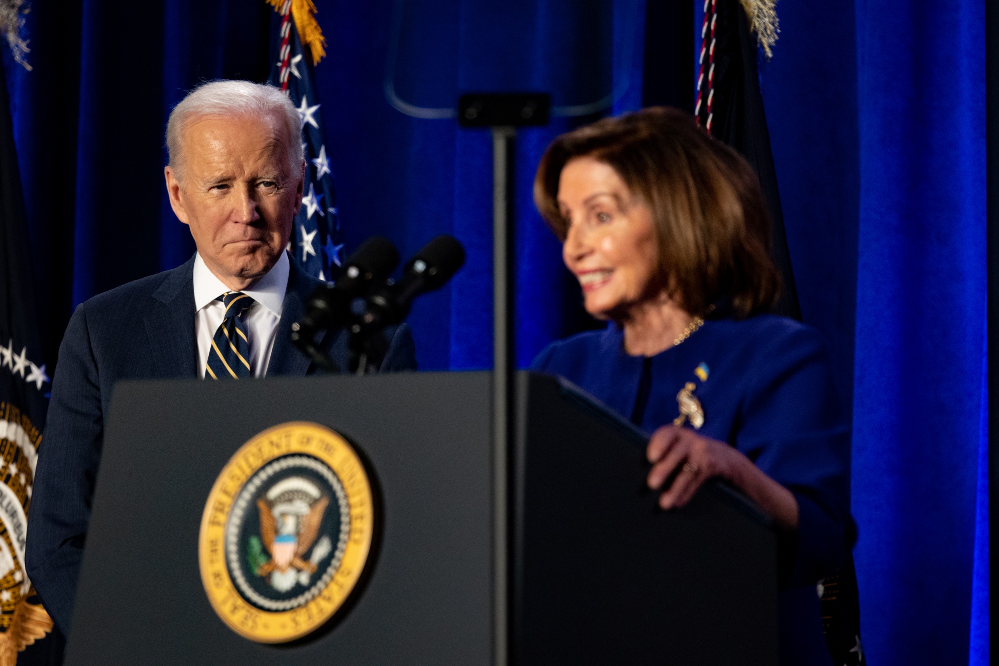 美国总统乔·拜登在宾夕法尼亚州费城举行的众议院民主党问题大会上听取美国众议院议长南希·佩洛西的讲话,日期为3月11日。