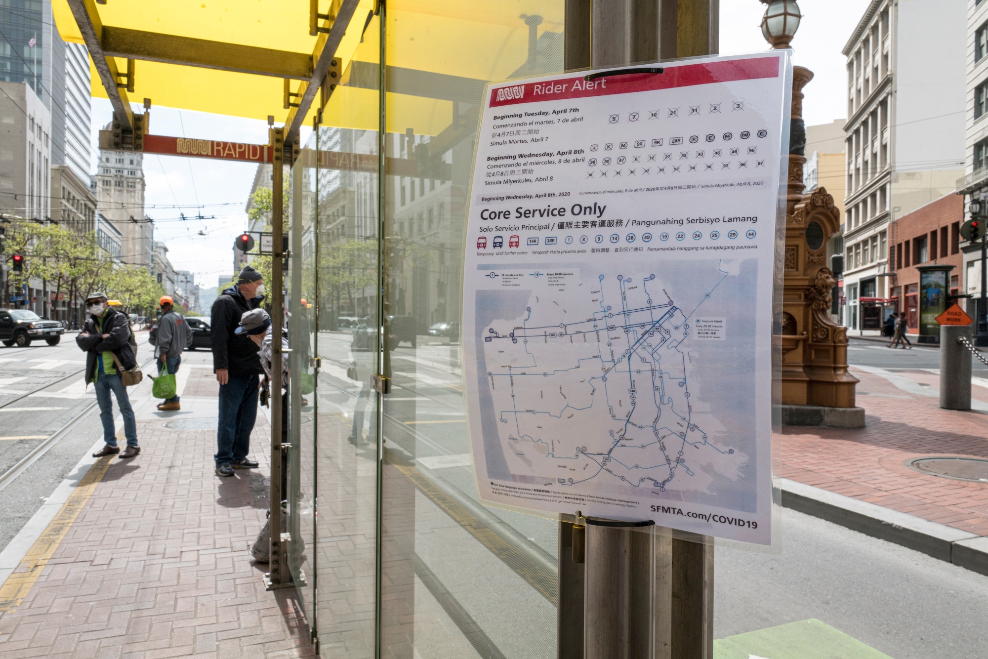 为了防止拥挤,旧金山交通局80%的公交线路被暂停,以及所有轻轨和缆车服务。这种有些违反直觉的想法是,剩下的17条“核心服务路线”将以更高的频率运行,等待时间将缩短,乘客将能够保持社交距离。
