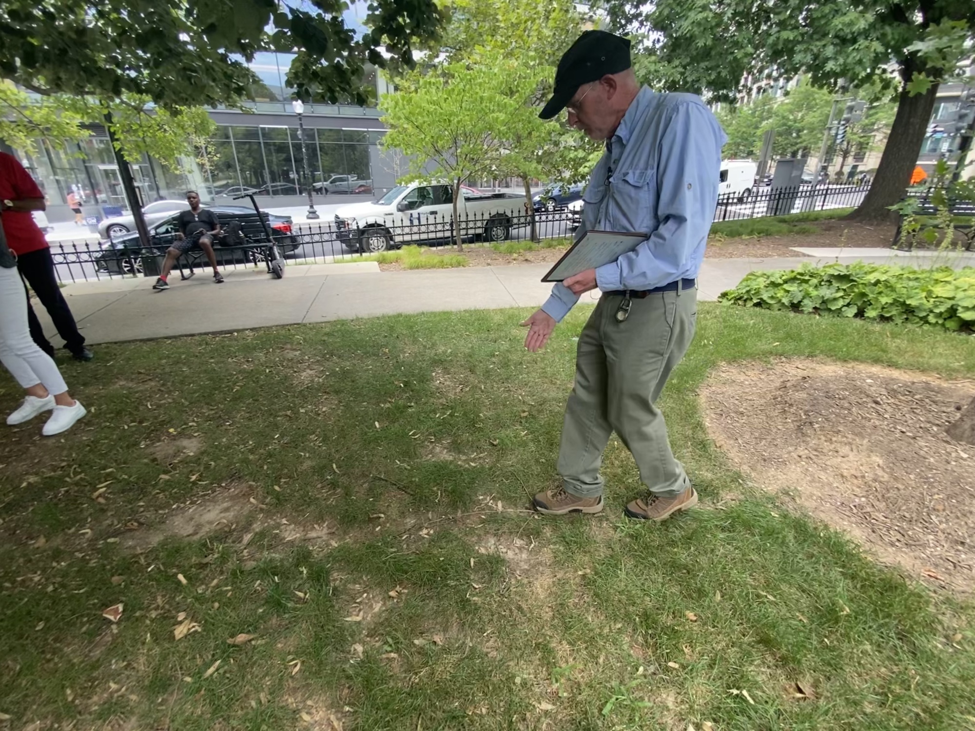 跟随它们的脚步:Corrigan在公园里追踪一条明显的老鼠路径。照片:Linda Poon/Bloomberg CityLab随后,Corrigan带领我们前往附近的詹姆斯·门罗公园,这是一个被许多餐馆环绕的小绿地。像这样的城市空间是理想的老鼠庇护所,他说。