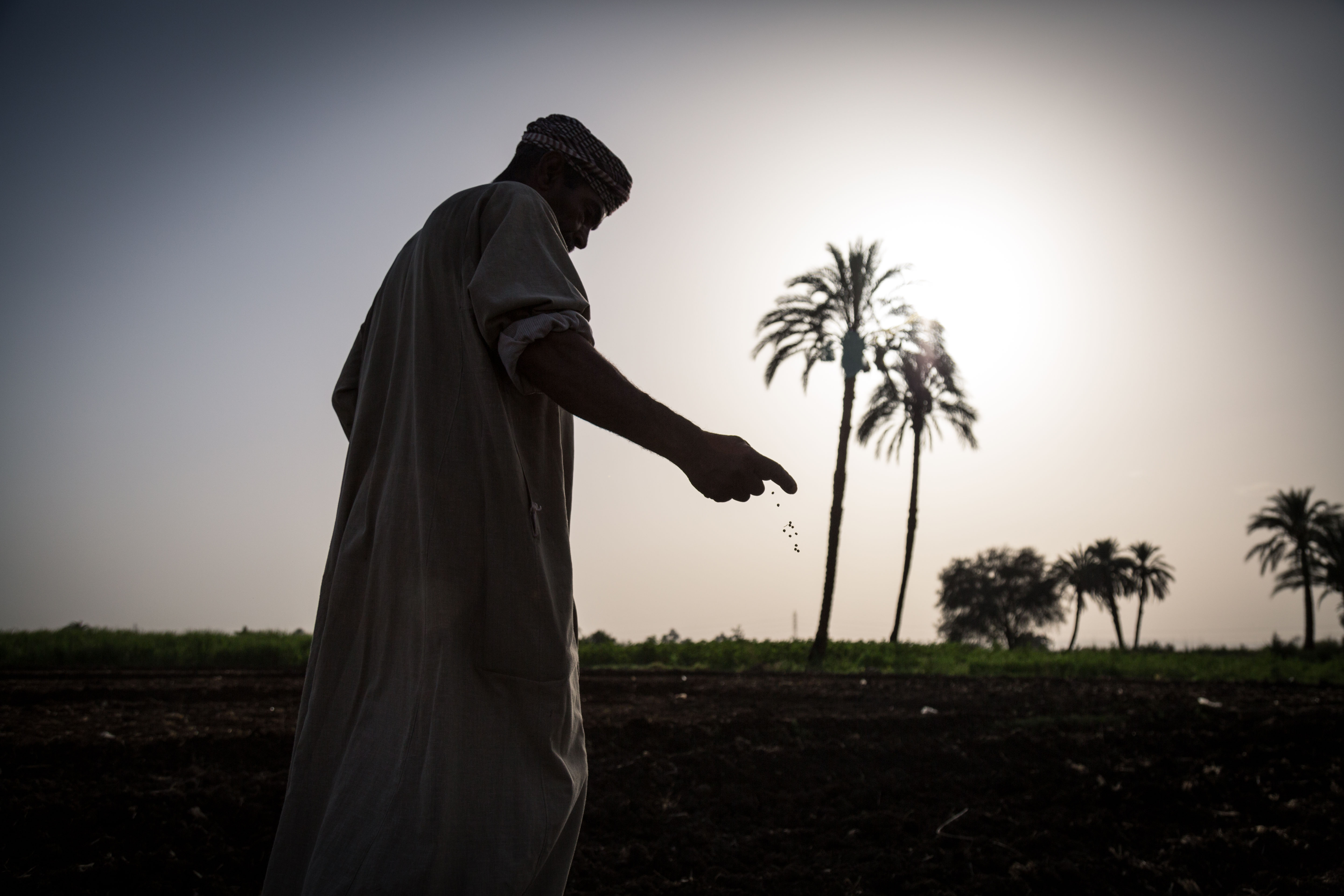 一位农民在埃及卢克索附近的田地里播种。
