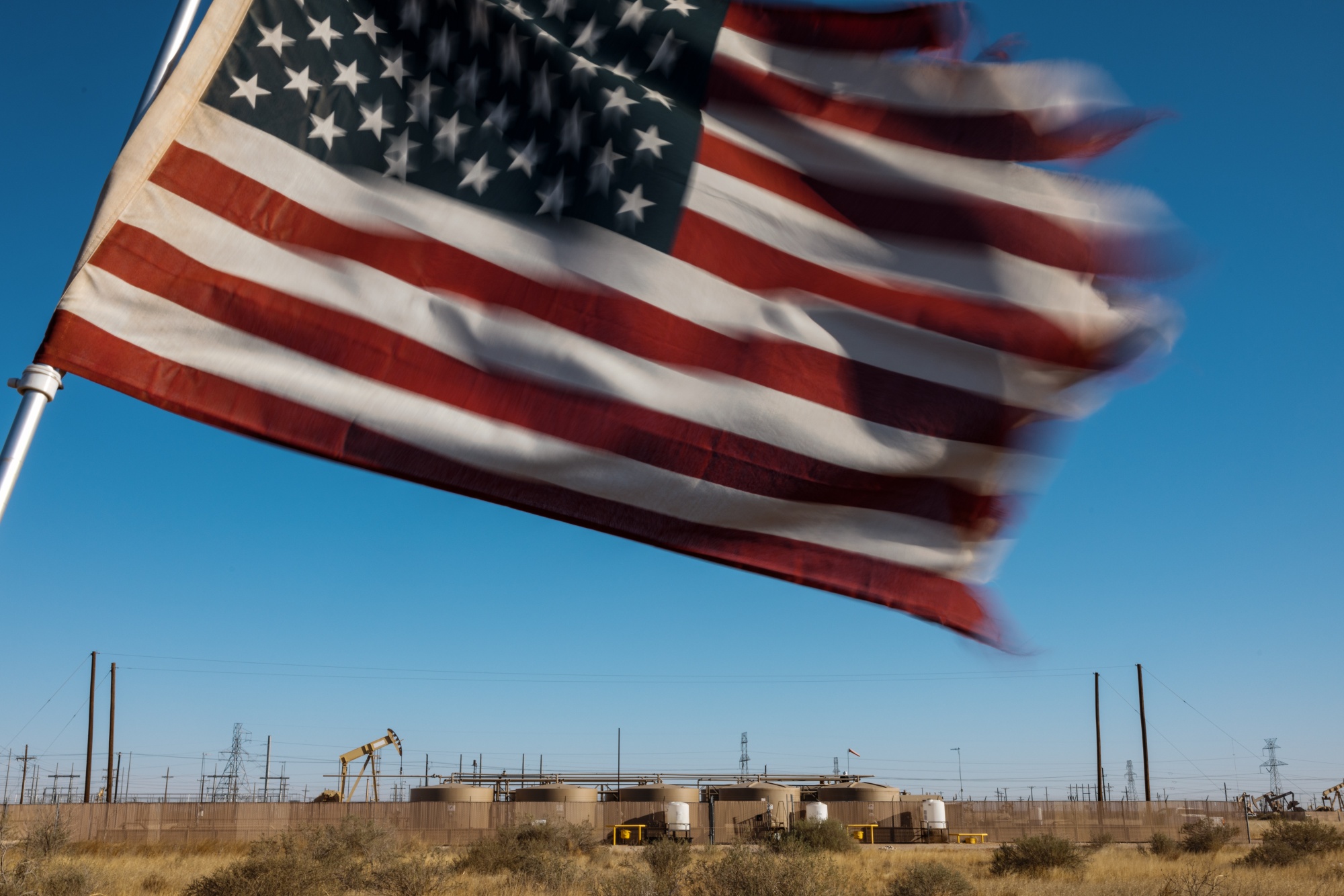 得克萨斯州奥德萨的一处石油租赁地入口处悬挂着美国国旗,拍摄于2022年4月5日。