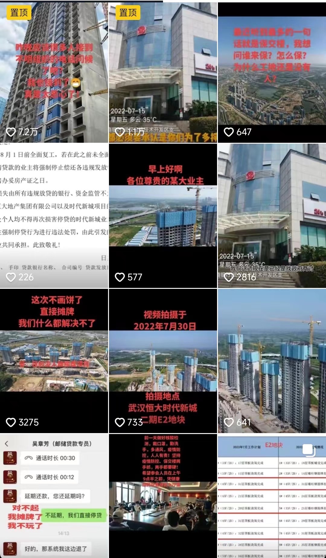 随着挫折感不断加剧,景德镇的一名购房者在一个微信群中提出了抵押贷款抵制的想法。这一举动并非没有风险,因为任何逾期付款都会毁掉信用评分,使未来更难购买房地产。尽管如此,听说有购房者在几个恒大项目上采取了同样的行动后,还是有一些人附和了这个想法。其他人则转向抖音,中国版的TikTok,在那里许多不满的人发布了他们自己的视频和照片。