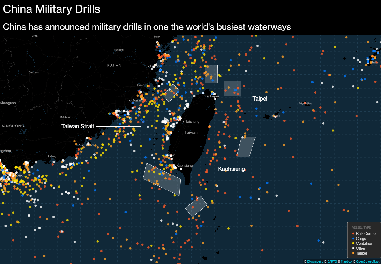 最后 … 中国宣布在台湾周围进行军事演习 —— 这是世界上最繁忙的水域之一 —— 正在对全球供应链产生涟漪效应,导致航线改道和能源运输延误。据消息人士称,燃气供应商正在重新规划或减缓部分前往北亚的液化天然气船只的航速,本周末前往台湾和日本的货物将受到影响。