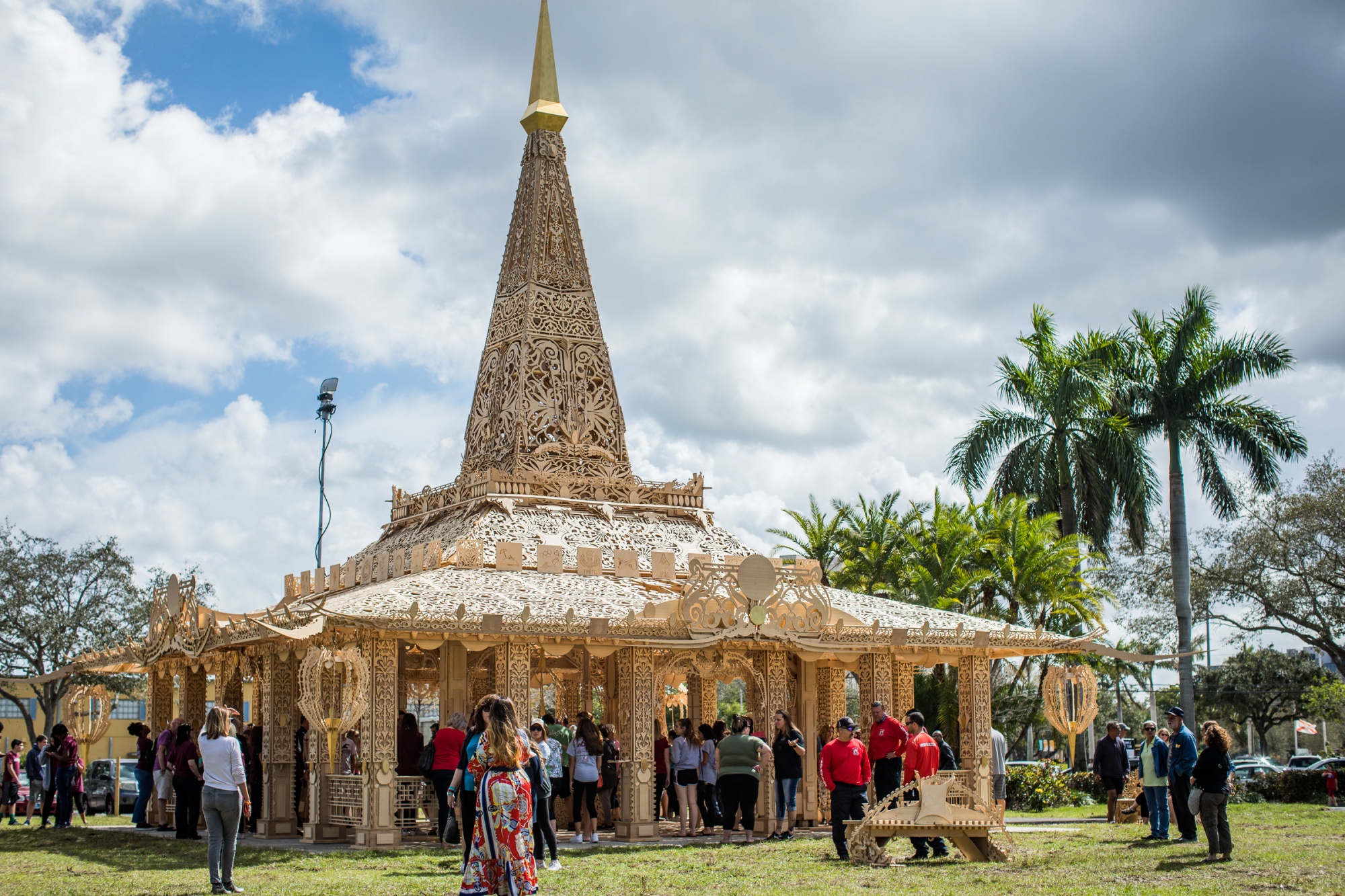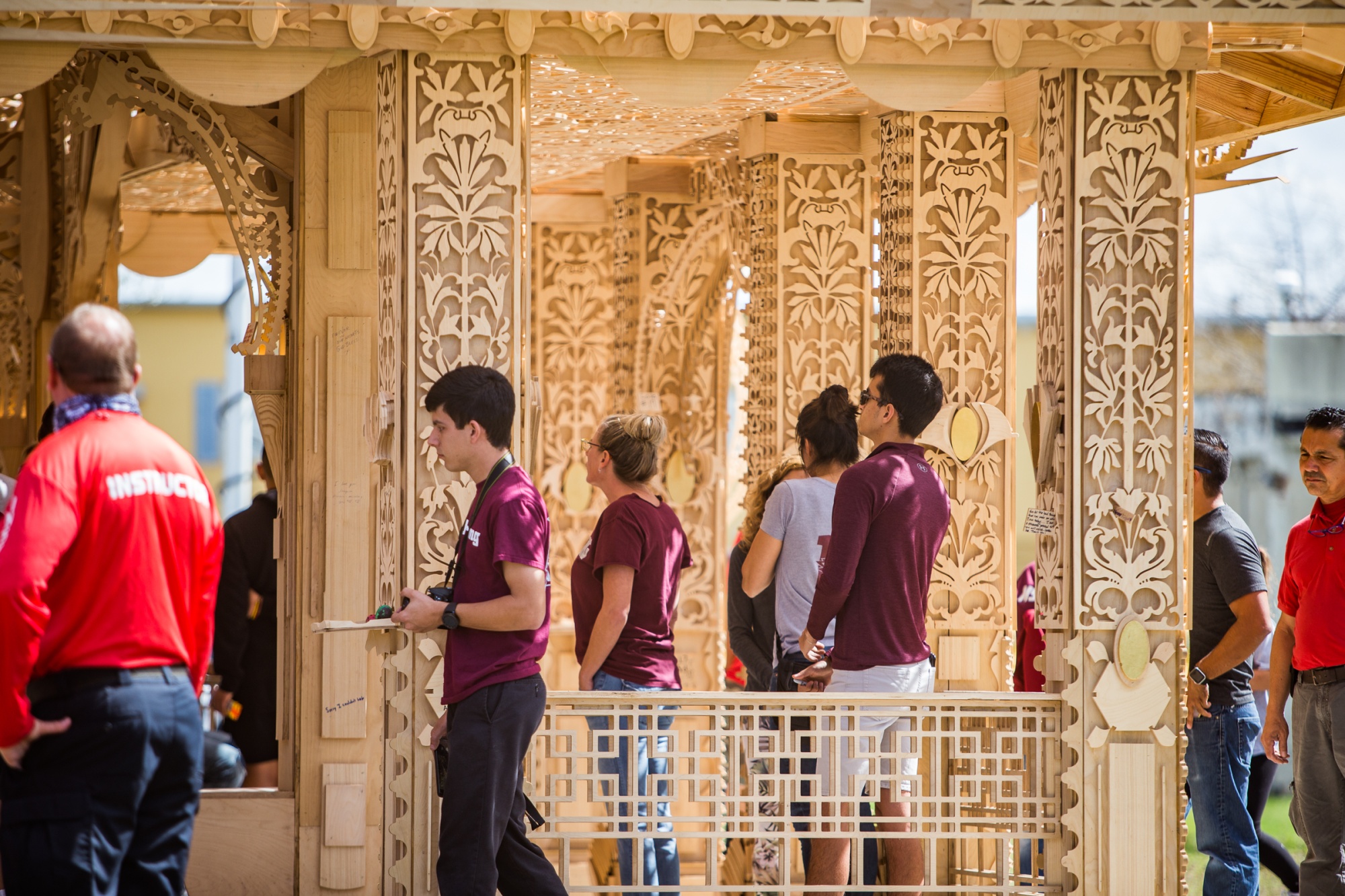 近距离观看“时间神殿”。摄影师: 伊恩·维特伦。这个公共艺术项目包括“时间神殿”,这是艺术家大卫·贝斯特设计的一座华丽的40英尺高胶合板结构,由社区的志愿者团队建造而成。在2019年它矗立的四个月里,“时间神殿”成为一个全天候可进入的聚会场所。居民们会前来与他人在一起,添加书面笔记,并留下小物件。