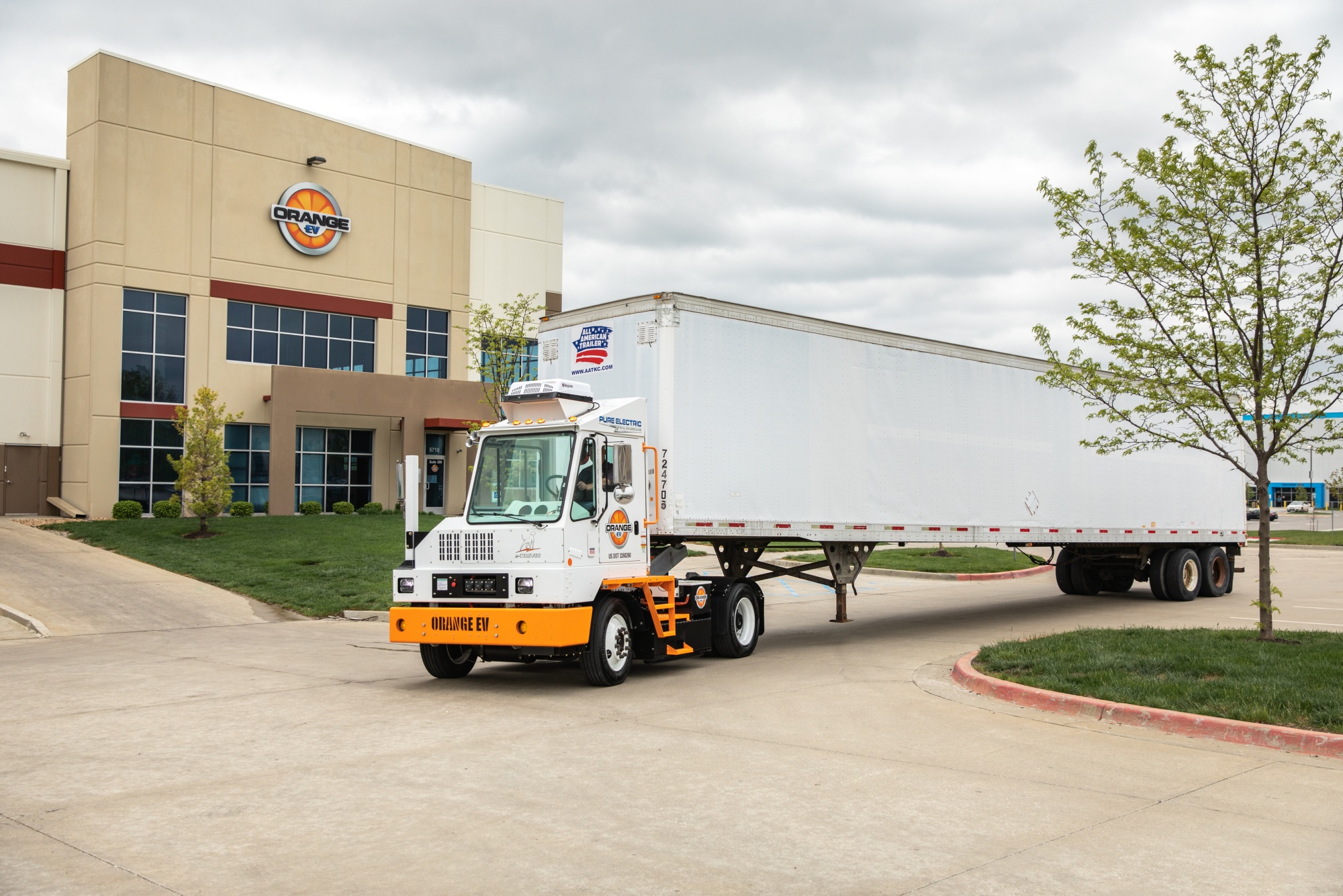 堪萨斯城,密苏里州的Orange EV公司总部,一辆场地卡车正在移动一辆拖车。