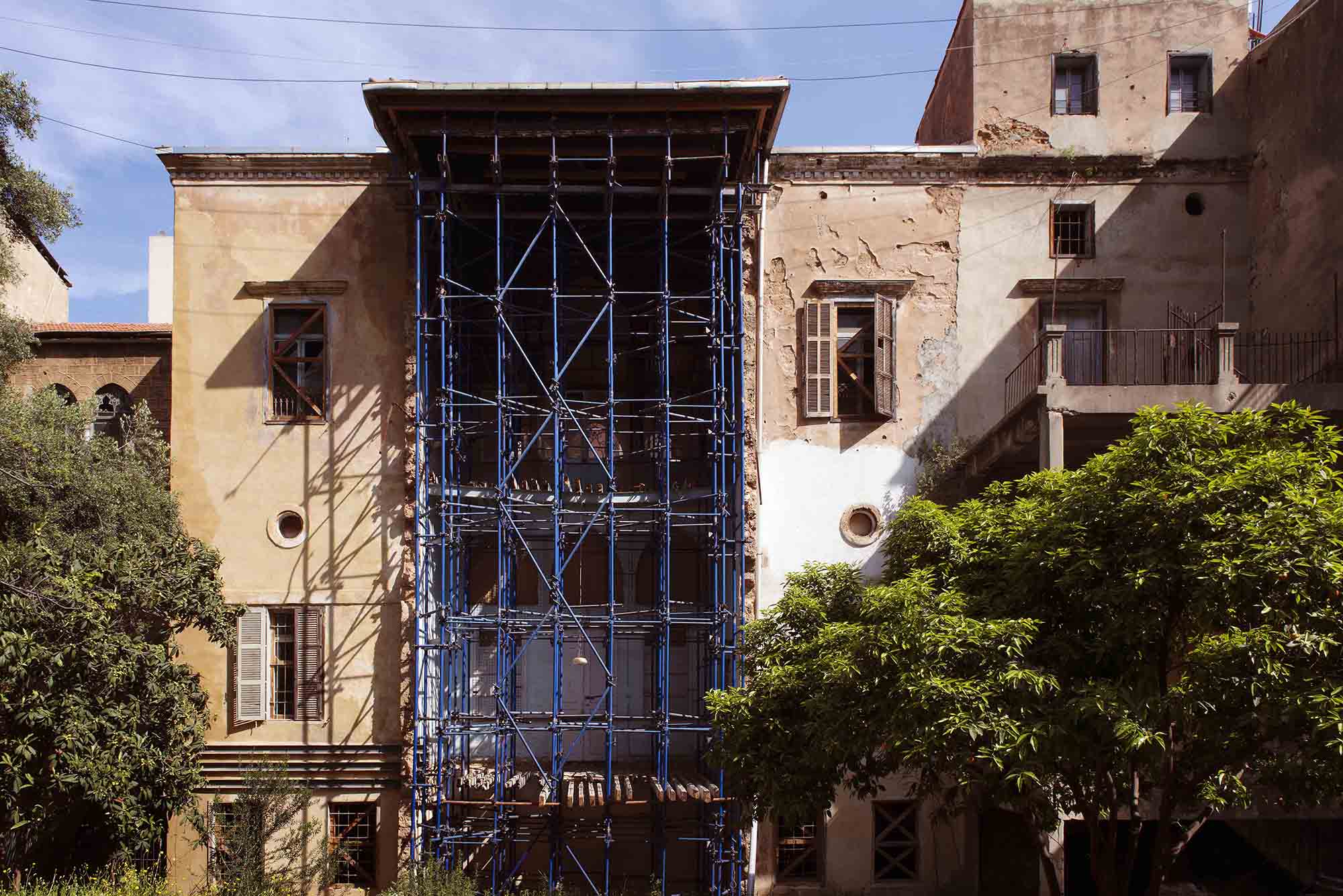 贝鲁特,黎巴嫩,贝鲁特的传统19世纪黎巴嫩房屋南立面上的脚手架。