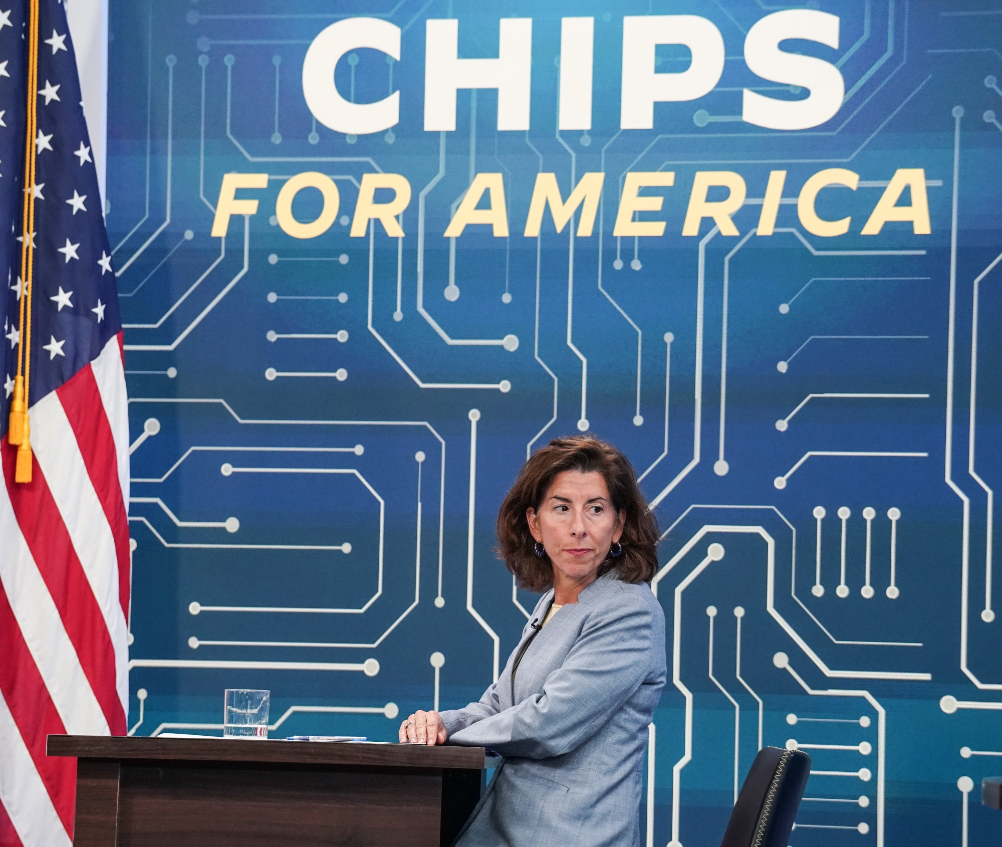 吉娜·雷蒙多,美国商务部长,在乔·拜登总统7月25日在华盛顿艾森豪威尔行政办公大楼举行的有关芯片法案的虚拟会议中发言