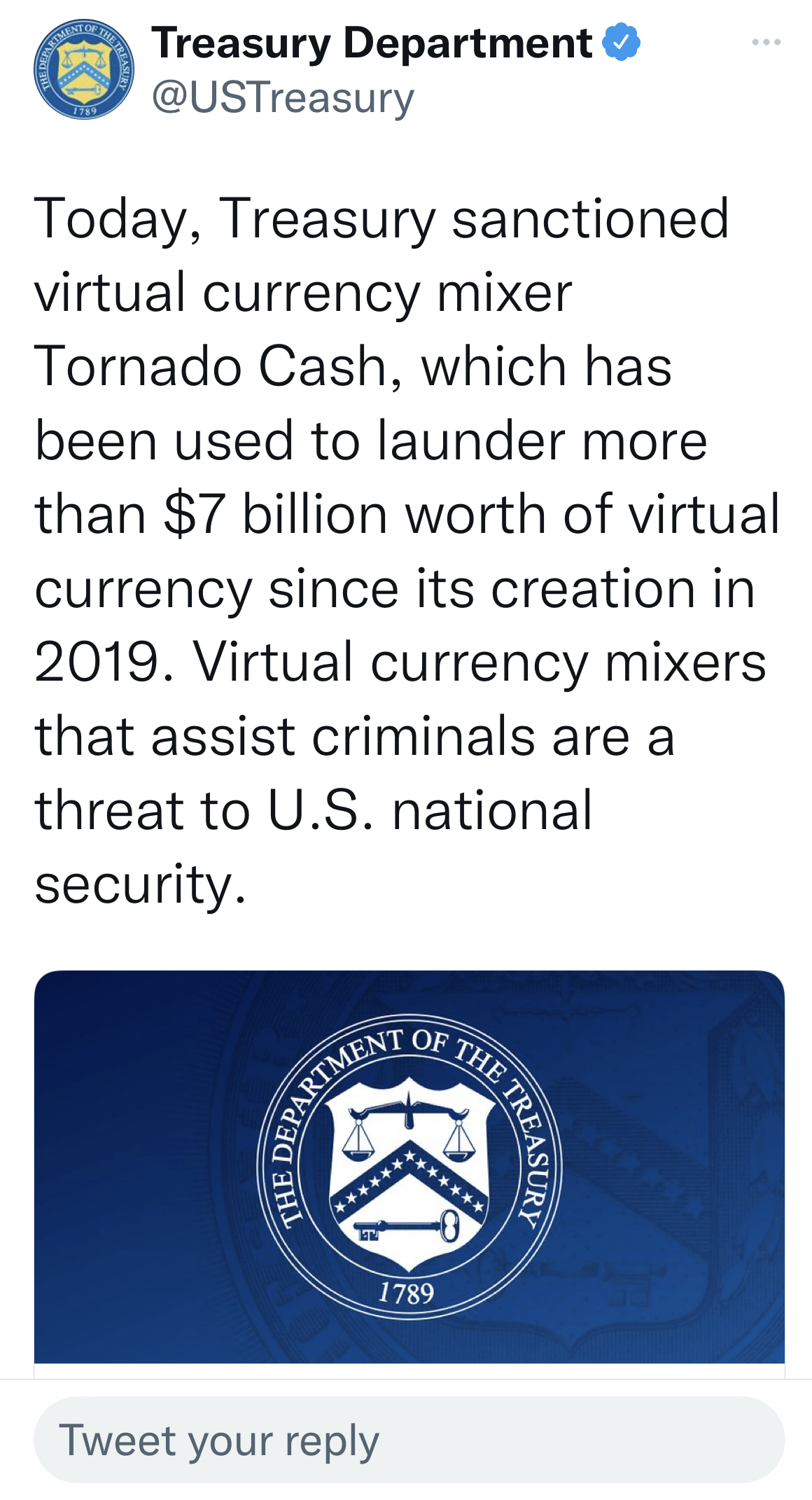 来源:@USTreasury](https://twitter.com/USTreasury/status/1556655337431785472)Tornado的创始人之一告诉彭博社,今年早些时候称,对其平台基础的智能合约执行制裁“在技术上是不可能的”,这意味着从理论上讲,其业务应该逃脱了法律的长臂。事后看来,我们现在可以看到Tornado没有考虑到一个基础设施上的弱点,这是该行业尚未解决的:加密货币还没有完全建立起自己的一切。