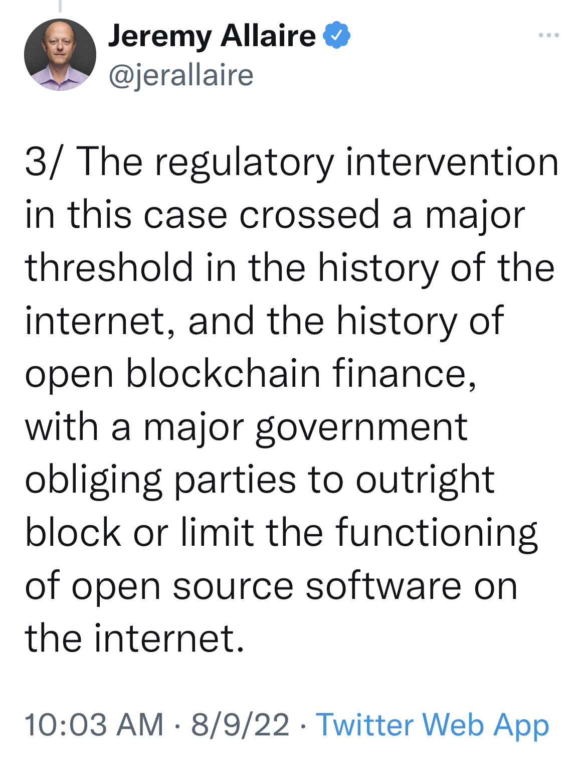 来源: @jerallaire](https://twitter.com/jerallaire/status/1557004770723995650)加密货币最大的卖点之一是,它被认为是绕过政府审查的一种方式,是一个无国界的货币系统,将金融自由置于核心位置。在二月份,当比特币持有者希望为加拿大卡车司机提供一种方式,使他们不会被冻结银行账户时,它已经在这个概念上遇到了困难 —— 据报道,加密交易所和钱包被迫遵守相同的规则,他们未能实现这一目标。
