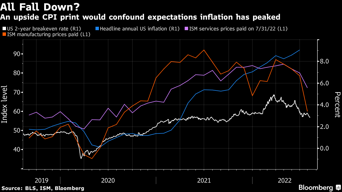 美国的CPI报告将在美国交易时段发布,市场明显感到紧张,担心它会再次出乎意料地向上飙升,尽管大多数投资者已经预计7月的通胀率将明显低于6月的9.1%的年度增速。作为债券市场预期的指南,通胀预期已经达到顶峰,两年期利率下跌至3%以下表明实际通胀已经达到顶峰,或者很快将达到顶峰,并且将很快回落。尽管就业数据保持强劲,但来自商业调查的一系列其他信号以及原油价格的下降都支持市场的立场。
