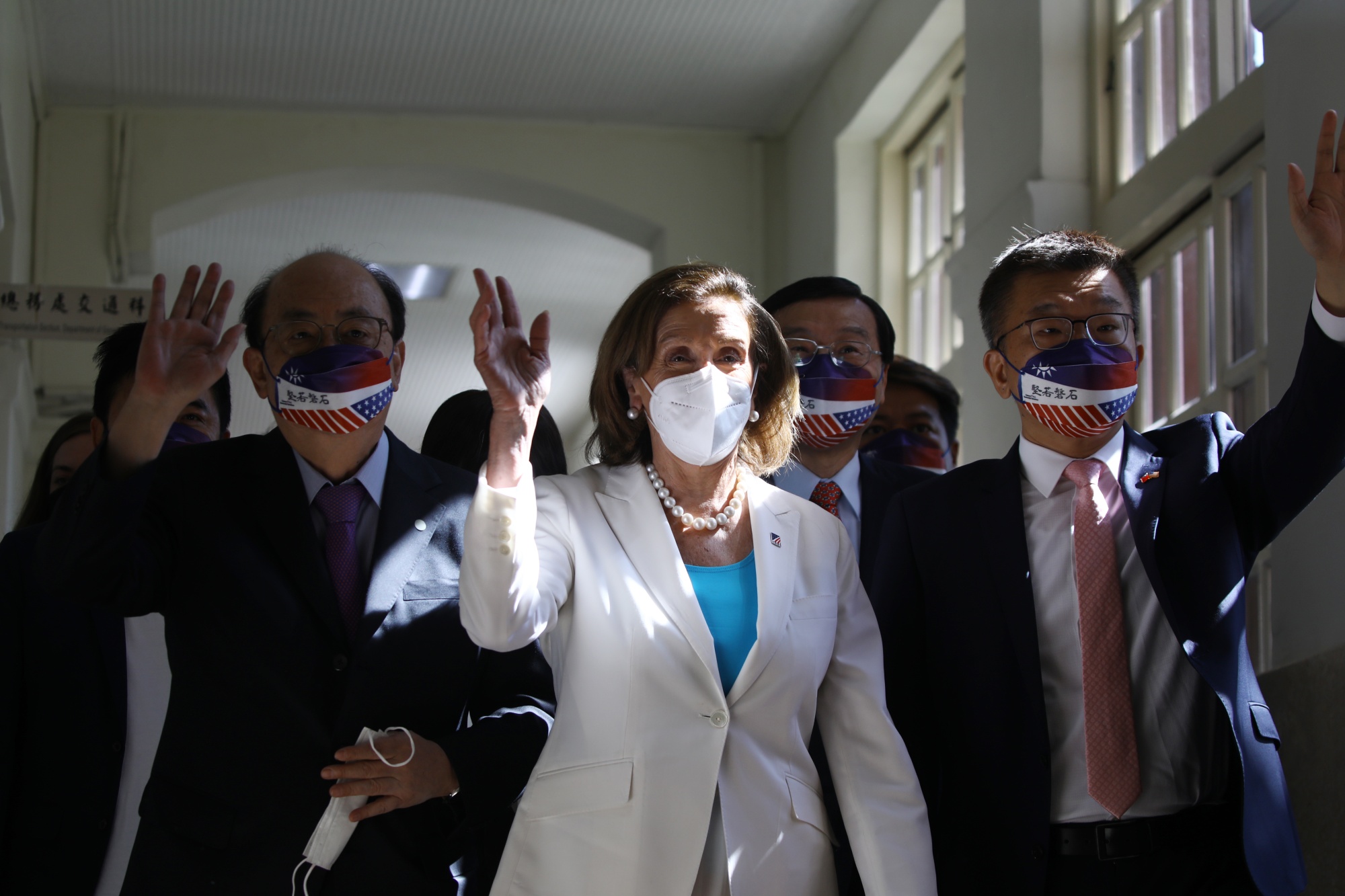 南希·佩洛西,中间,于8月3日抵达台北立法院。
