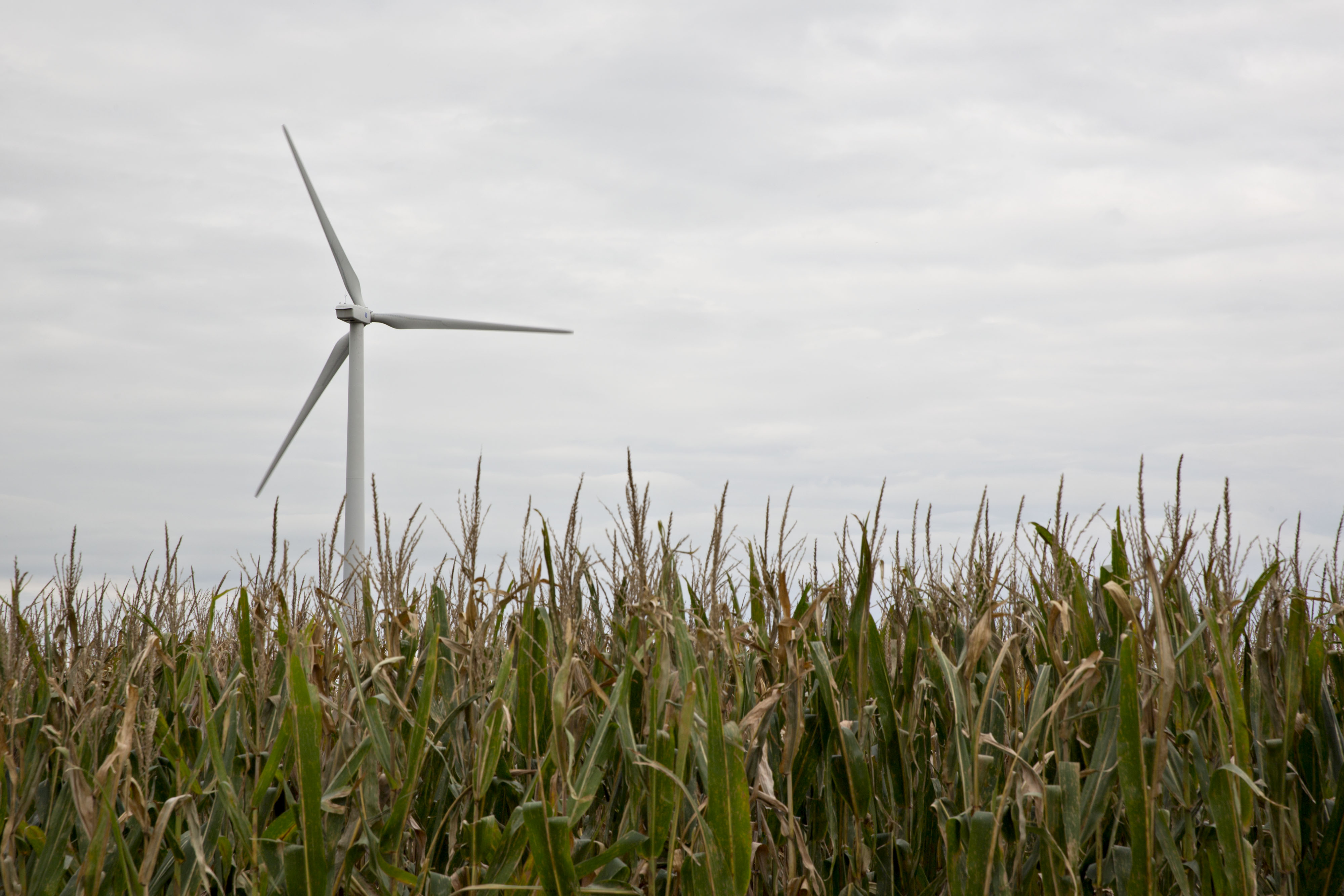 一个风力涡轮机矗立在爱荷华州的格林菲尔德的田野中。