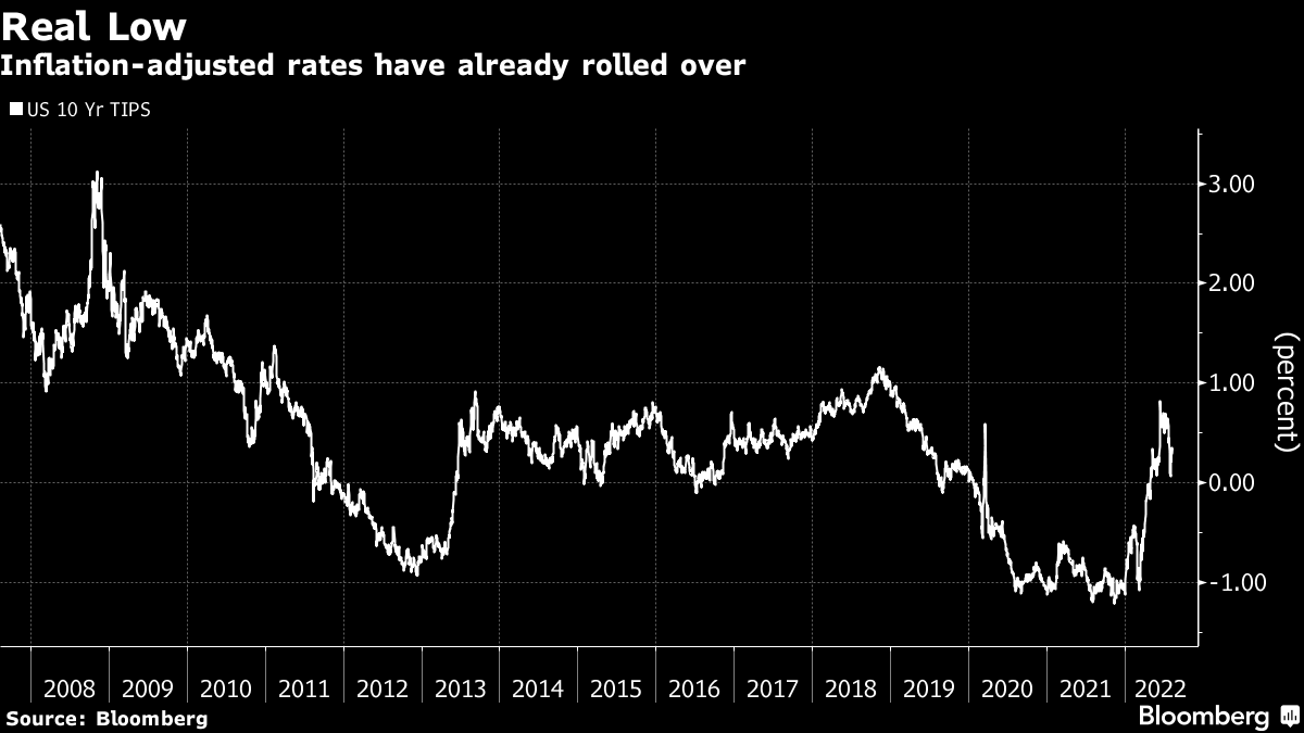 实际利率显示金融条件有多宽松。在这一周期中,实际10年期利率甚至没有达到2018年底美联储上次加息时的水平。它们比那些水平下降了约八个百分点。
