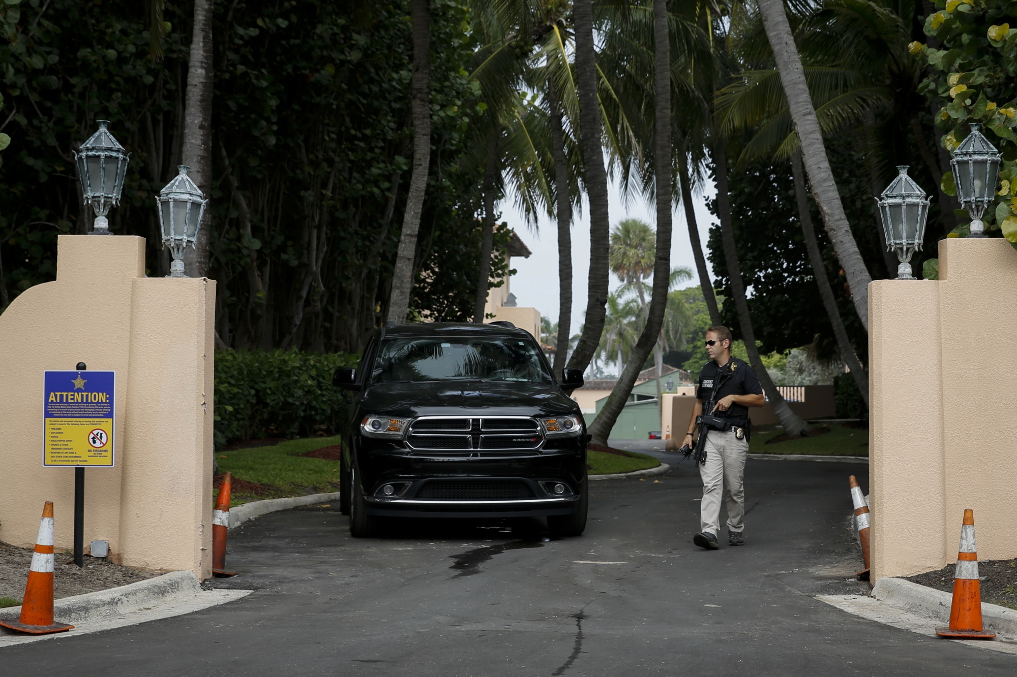 美国特勤局成员在佛罗里达州棕榈滩的马阿拉戈入口处,2022年8月9日。