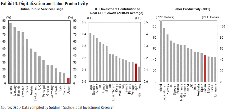 “在数字化转型方面,日本在公共和私营部门都落后于许多其他国家,”鲍波写道。高盛分析师发现,在过去三十年中,企业对信息和通信技术的投资特别是远远落后于美国。