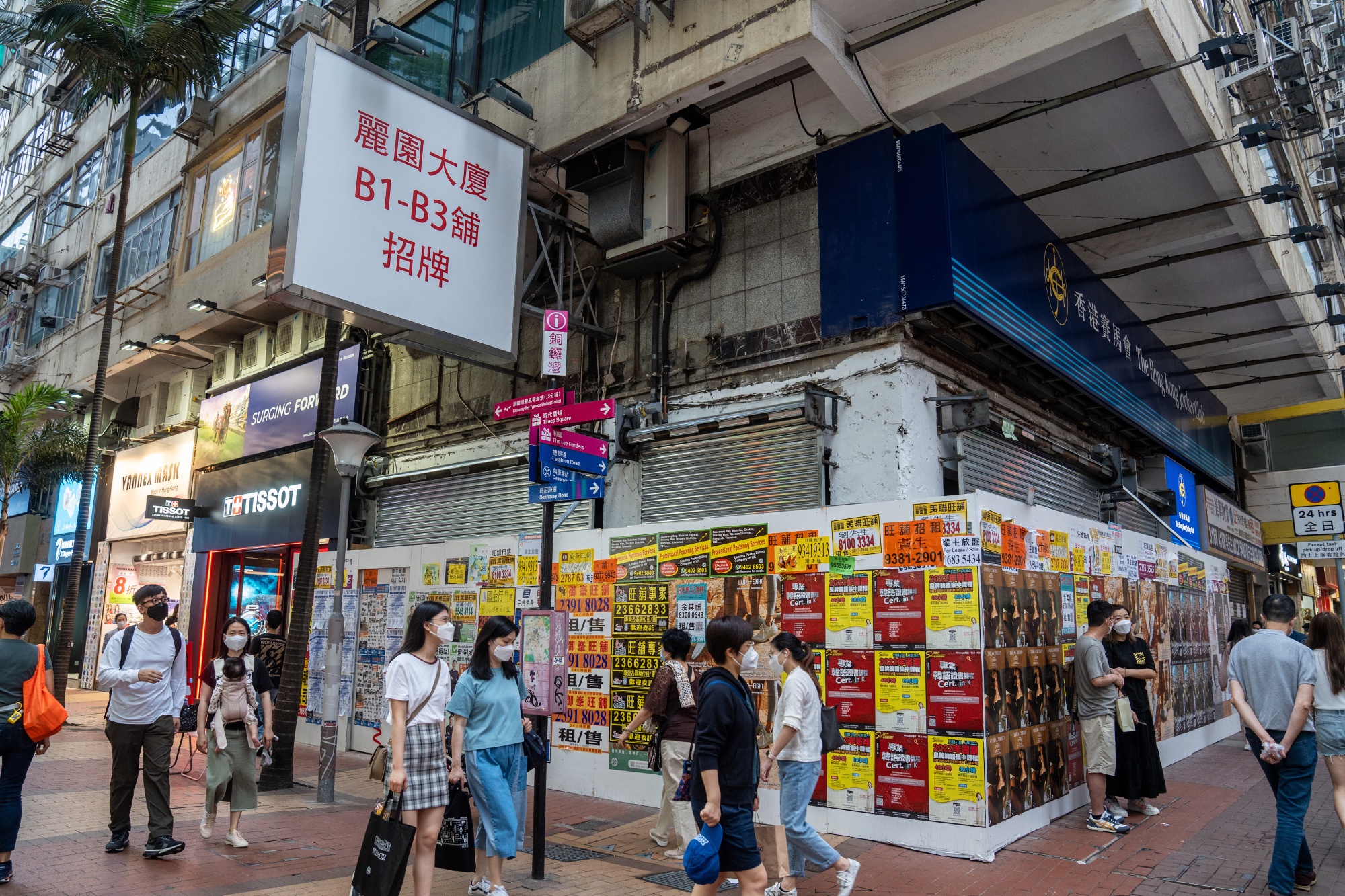 在香港一家空置商店的外墙上张贴的商业空间出租广告。