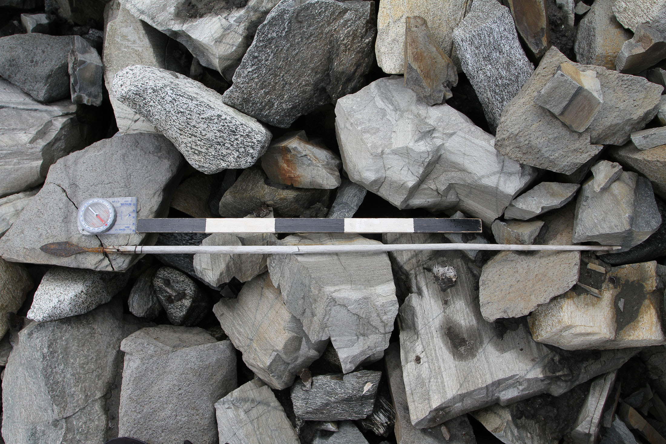 一件靠近融化冰川发现的束腰外衣。摄影师:维维安·旺根(Vivian Wangen)在挪威的高山上,冰川考古学家拉斯·皮洛(Lars Pilø)及其团队在冰川考古项目中发现了一些奇特的文物,包括一件铁器时代的羊毛束腰外衣,一只罗马风格的鞋子以及一支保存完好的、仍附有羽毛的箭,年代为公元300年至600年。这支箭是从一个驯鹿狩猎遗址中发现的文物。
